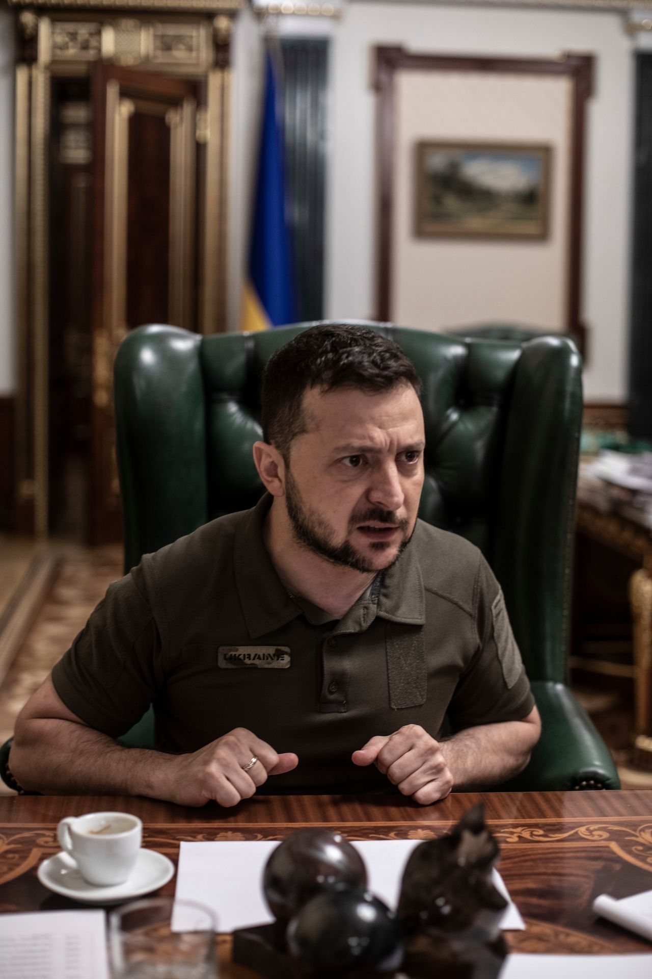 自2月以來,澤連斯基先生只離開基輔去訪問前線城市,日夜待在總統府邸,窗户用沙袋遮擋,外面停着裝甲車。他説,他平均每天以醒來後查看最新的傷亡人數和俄羅斯導彈襲擊的新聞開始。