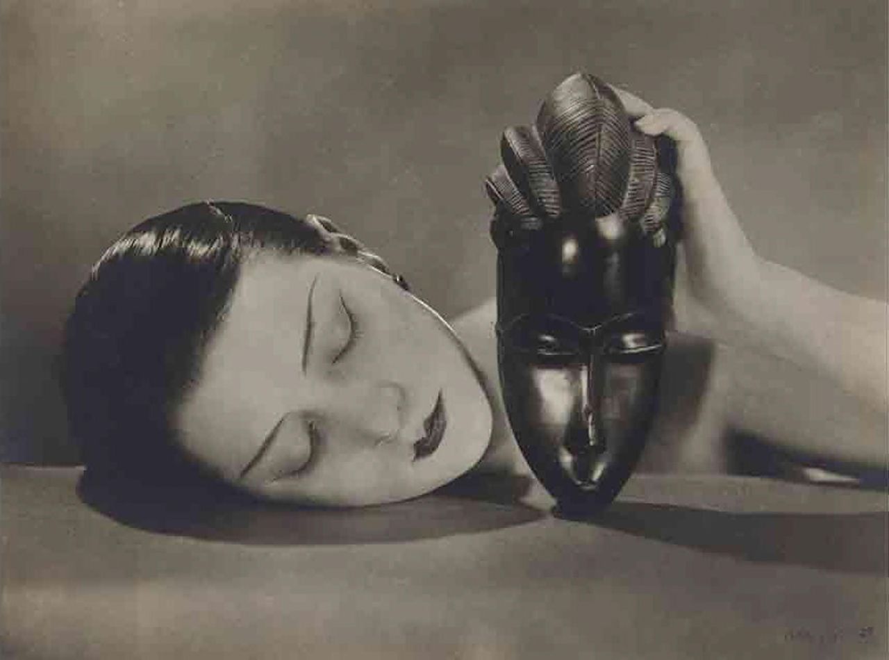 曼·雷感到一絲競爭壓力,這使他們的合作關係變得微妙;在給密友的信中,他輕蔑地稱她為業餘愛好者。她渴望承諾,甚至專程前往紐約見他的家人,卻遭到他的冷淡迴避。這種矛盾心理體現在那幅如今被稱為《黑白》的絕美照片中。他將琪琪的面孔與非洲雕刻面具並置(自盧梭《睡着的吉普賽人》和畢加索《亞維農少女》以來歐洲藝術家鍾愛的主題),將她標誌性的波波頭向後梳得光滑,以模仿面具程式化的髮型,形成橢圓與明暗對比的優雅幾何構圖。曼·雷至少調整了二十個版本,卻從未改動過面具。正如布勞德所言,《黑白》“交織着現代主義對性、種族與殖民主義的迷戀”:“琪琪與曼·雷將巴黎在這火紅十年上半葉的所有精華都濃縮在這個矩形畫框裏,卻未越出空蕩牆壁的界限。作為時尚巔峯的巴黎。作為帝國心臟的巴黎。將非洲人異化為原始圖騰的巴黎…《黑白》是一幅關於所有未顯之事的圖像。”