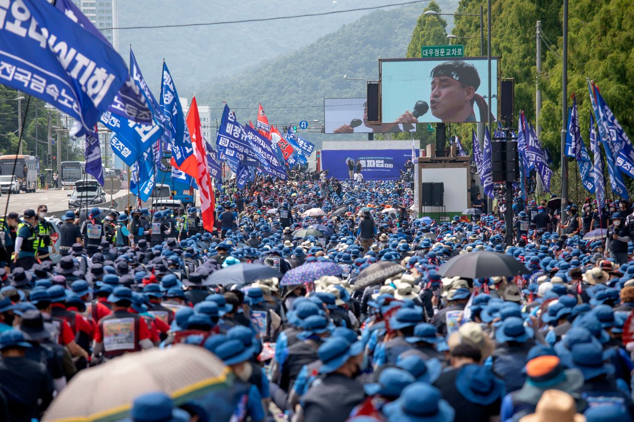 本週,韓國金屬工人工會成員在韓國巨濟市大宇造船廠參加集會。圖片來源:Ryu Seung-Il/Zuma Press首爾——全球最大造船企業之一週五與分包工人就工資問題達成協議,結束了持續數週的罷工。此次罷工造成約6億美元損失,並推遲了市場急需的液化天然氣運輸船的交付。