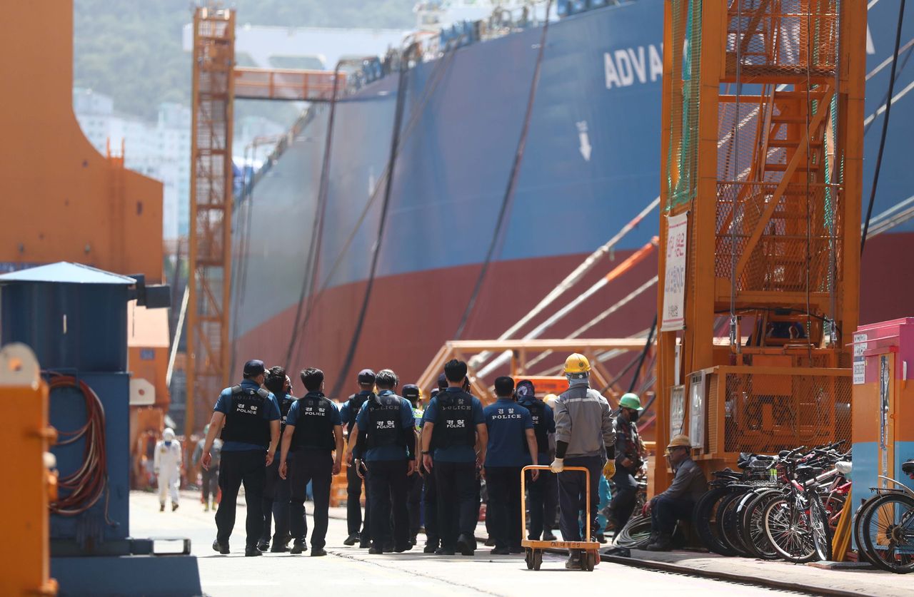 本週在巨濟市大宇造船廠看到的警察,大約120名罷工工人佔領了一艘在建油輪。照片:韓聯社/祖瑪通訊社金屬工人工會稱週五的協議是"韓國社會的一次有意義勝利"。大宇集團未立即置評。