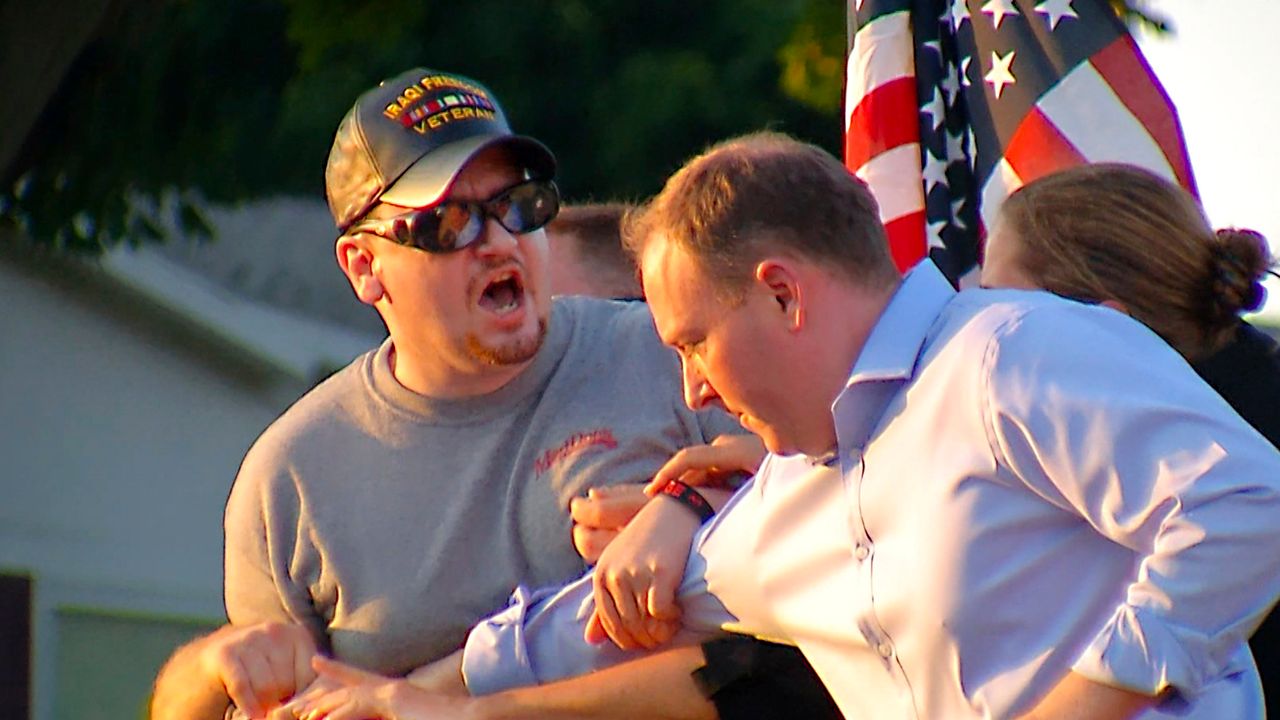 戴帽男子大衞·雅庫博尼斯本週被制服時,眾議員李·澤爾丁正抓住他的手腕。圖片來源:WHEC-TV/美聯社官員稱,一名男子在紐約競選集會上用尖鋭物品襲擊美國眾議員李·澤爾丁後,因聯邦襲擊指控被捕。