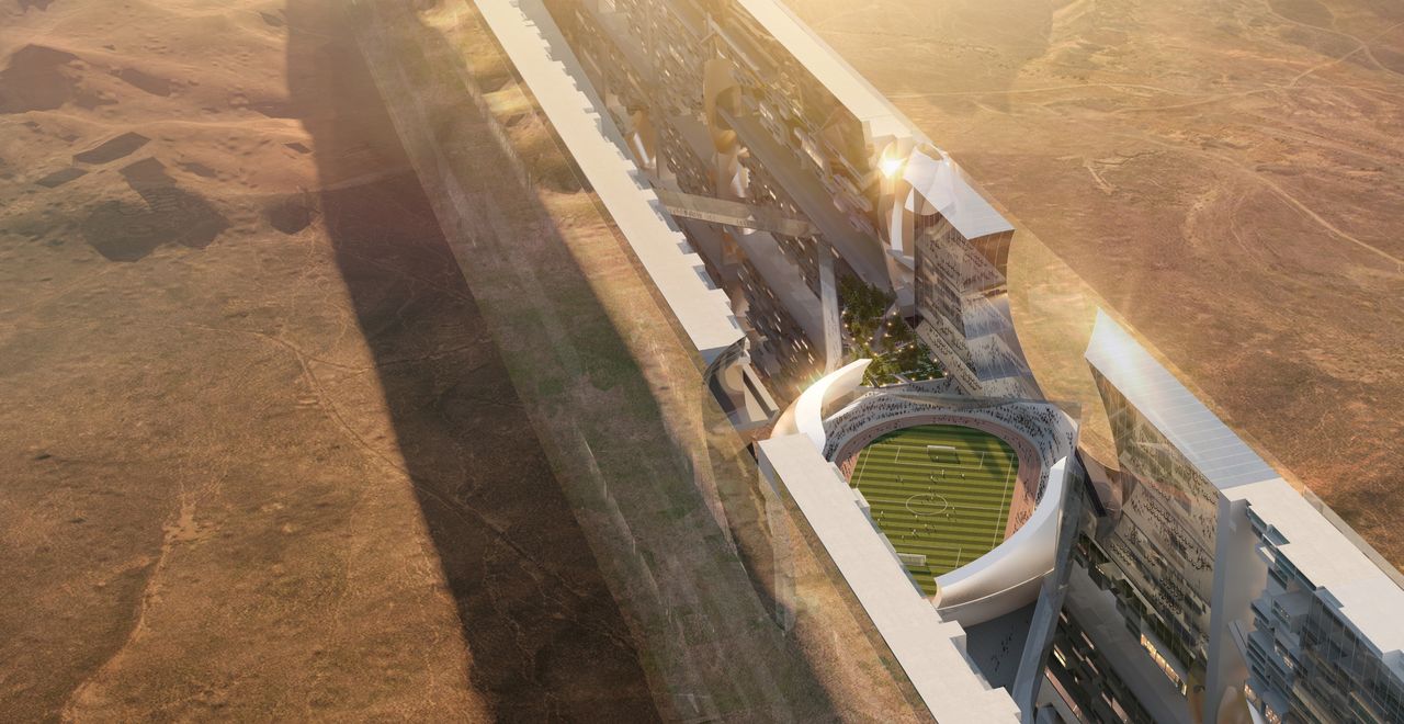 根據數百頁首次詳細闡述這一構想的機密規劃文件,城市規劃者提出的方案是打造世界上最大的建築結構:兩座高達1600英尺的平行建築,綿延75英里,橫跨海岸、山脈和沙漠地形,並通過步行道相連。
