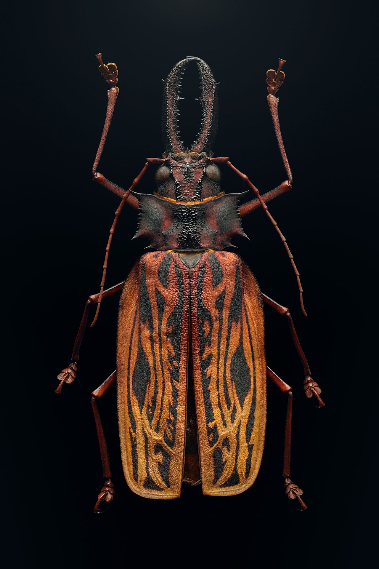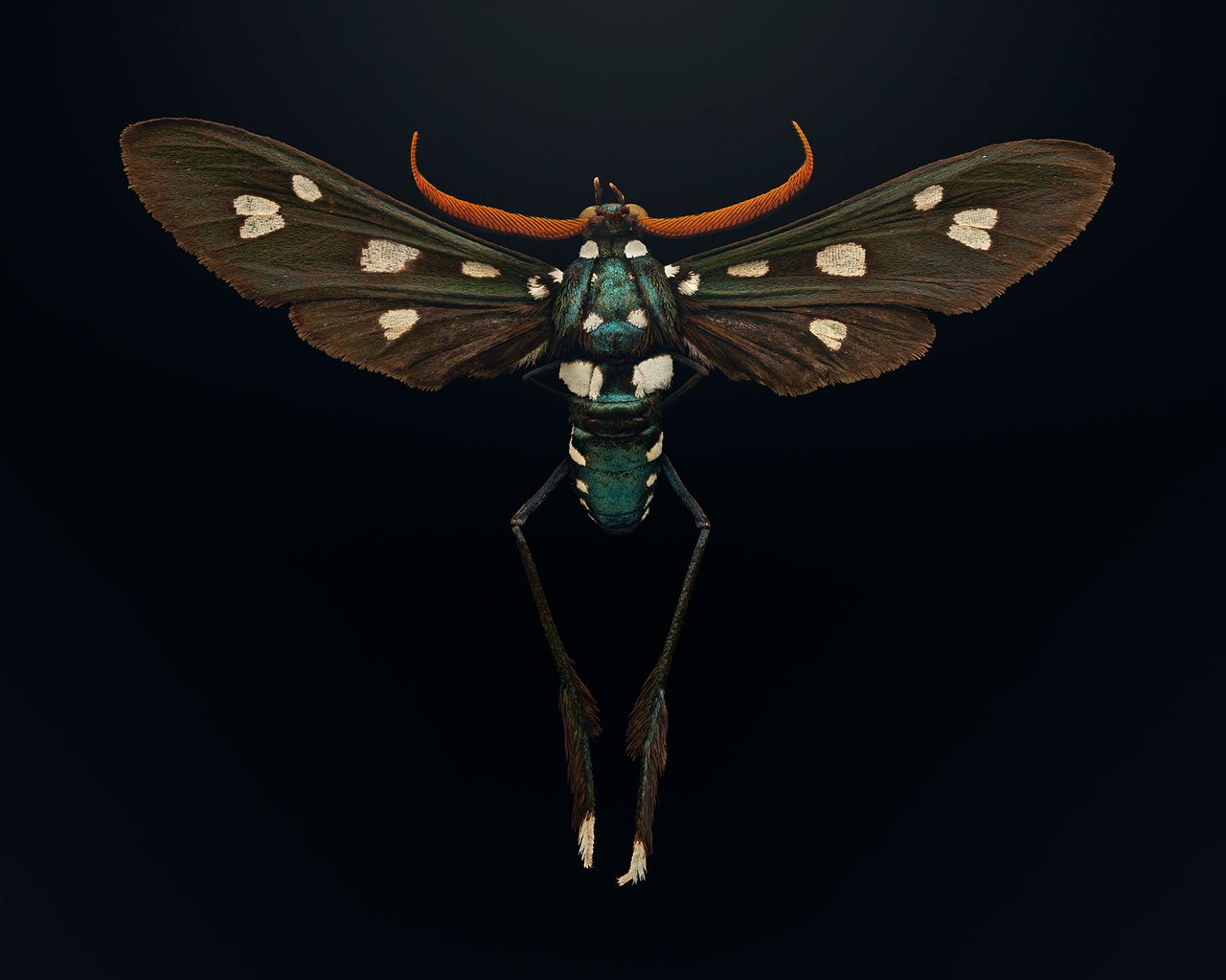小黃蜂蛾攝影:列文·比斯/美國自然歷史博物館該博物館擁有全球最大的昆蟲標本收藏之一,所有標本均經過裝裱和編目。格里馬爾迪先生與其他昆蟲學工作人員在比斯先生建議下,從這些微小遺骸中精選出40種進行拍攝。部分標本極為稀有,需獲得政府特別許可才能運往英國;另一些如1880年代採集的落基山蝗蟲標本則異常脆弱,必須由博物館專員親自護送至比斯工作室。每件標本平均需耗時三週、生成多達10,000份圖像文件才能完成最終合成。
