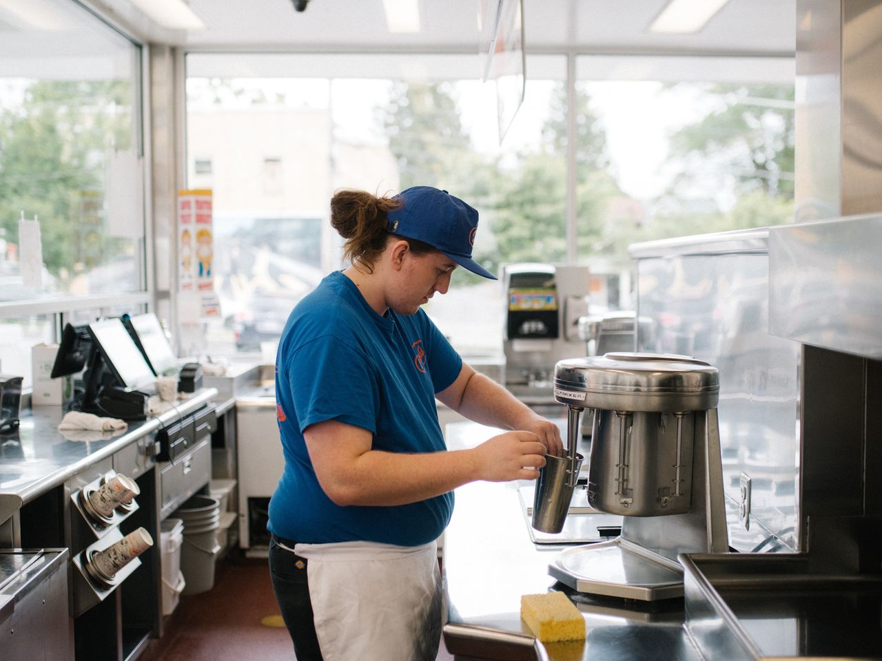 迪克餐廳員工雷文·温特斯正在沃靈福德分店清潔奶昔攪拌機。**撰稿人:**勞倫·韋伯,郵箱:[email protected];奇普·卡特,郵箱:[email protected]