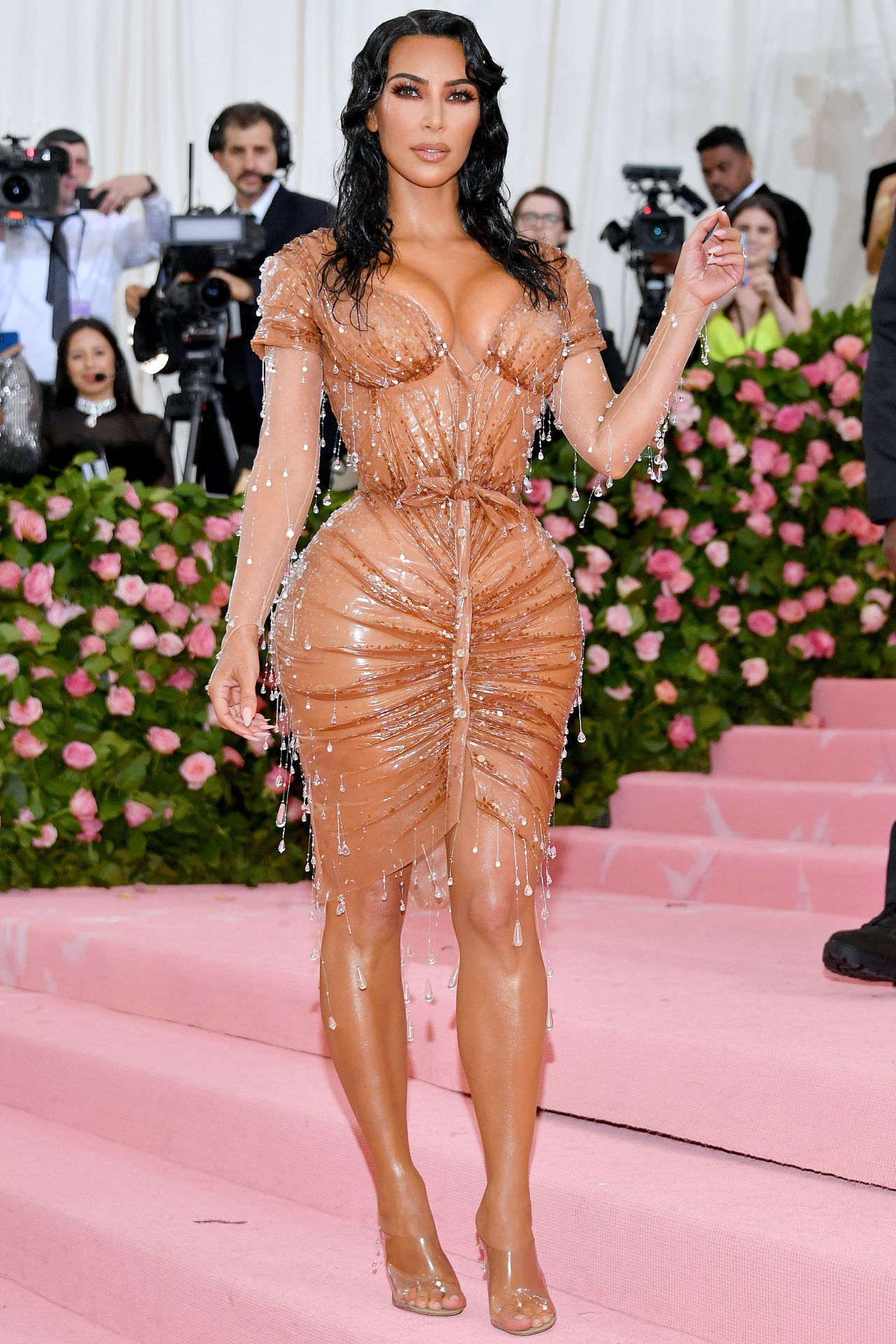金·卡戴珊在2019年Met Gala上身着滴膠Thierry Mugler禮服並搭配閃亮妝容。圖片來源:Getty Images若要營造比2019年Met Gala上金·卡戴珊更含蓄的濕發效果,可大量噴灑造型打底霧在頭頂,用手指將頭髮向後抓出紋理。“接納不完美,“特納先生建議,他在Lanvin春季秀場打造的油頭造型讓模特宛如剛離開Studio 54夜店的派對客。接着用三角定型髮網包裹頭部,用擴散吹風機定型後噴上高光髮膠。最後用免洗護髮素梳理髮絲。“髮梢應該保持靈動——不能僵硬,“特納強調。要打造杜阿·利帕和貝拉·哈迪德在Balenciaga七月高定秀場上的極致光潔造型,可將閃亮髮絲束成馬尾或髮髻。