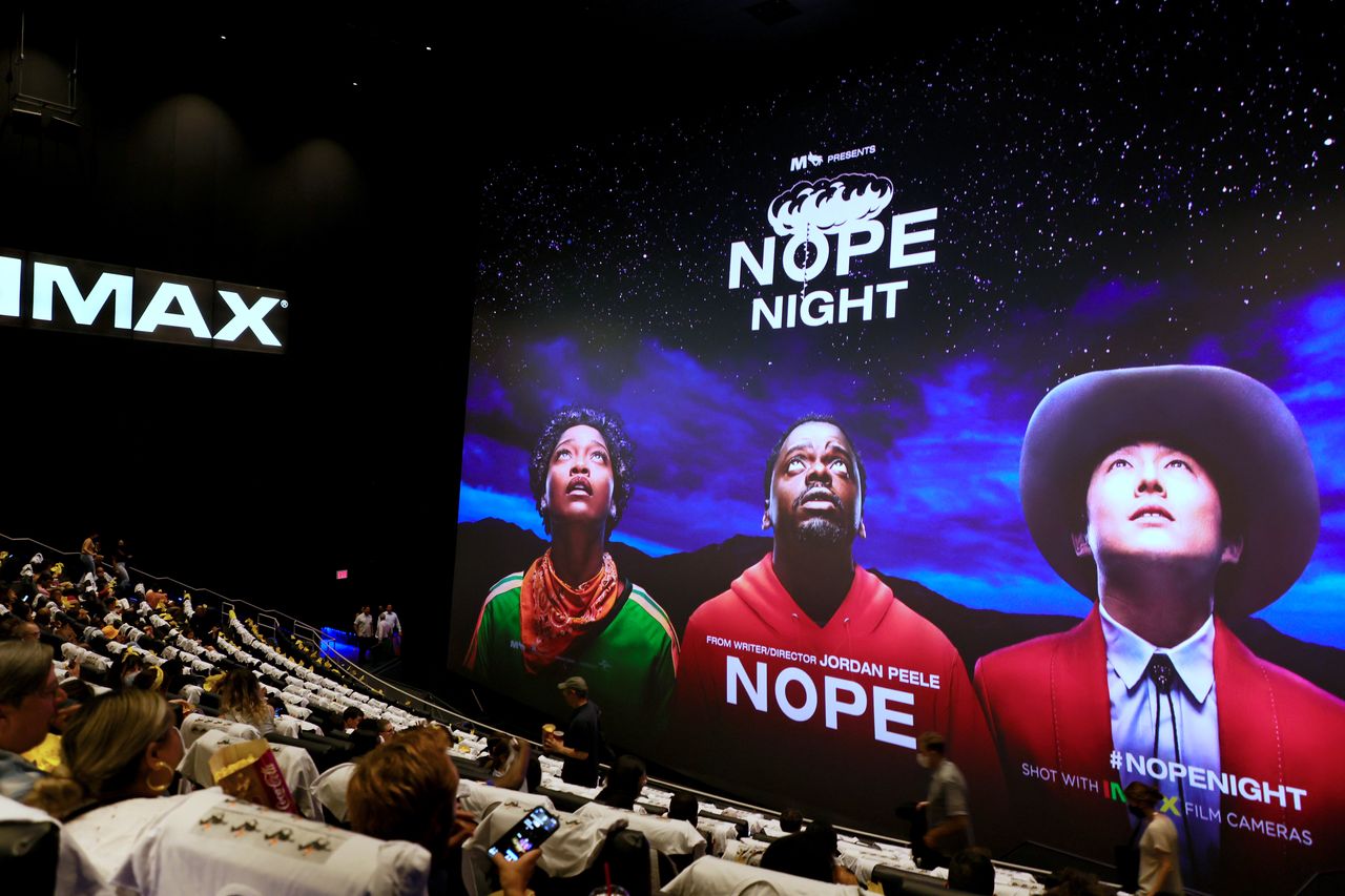 《不》在4400萬美元首映週末前舉行了夜間點映。圖片來源:Theo Wargo/Getty Images for Universal Pictures而如果你將“大片”視為一類為視覺奇觀打造的電影,《不》在上映前就已符合這一定義。這個關於雲層中吞噬馬匹和人類的威脅物體的故事,讓人聯想到《大白鯊》和《第三類接觸》。影片使用IMAX攝像機拍攝,專為最大銀幕呈現。近期宣傳語更承諾將帶來“一場天空中的電影盛宴”。