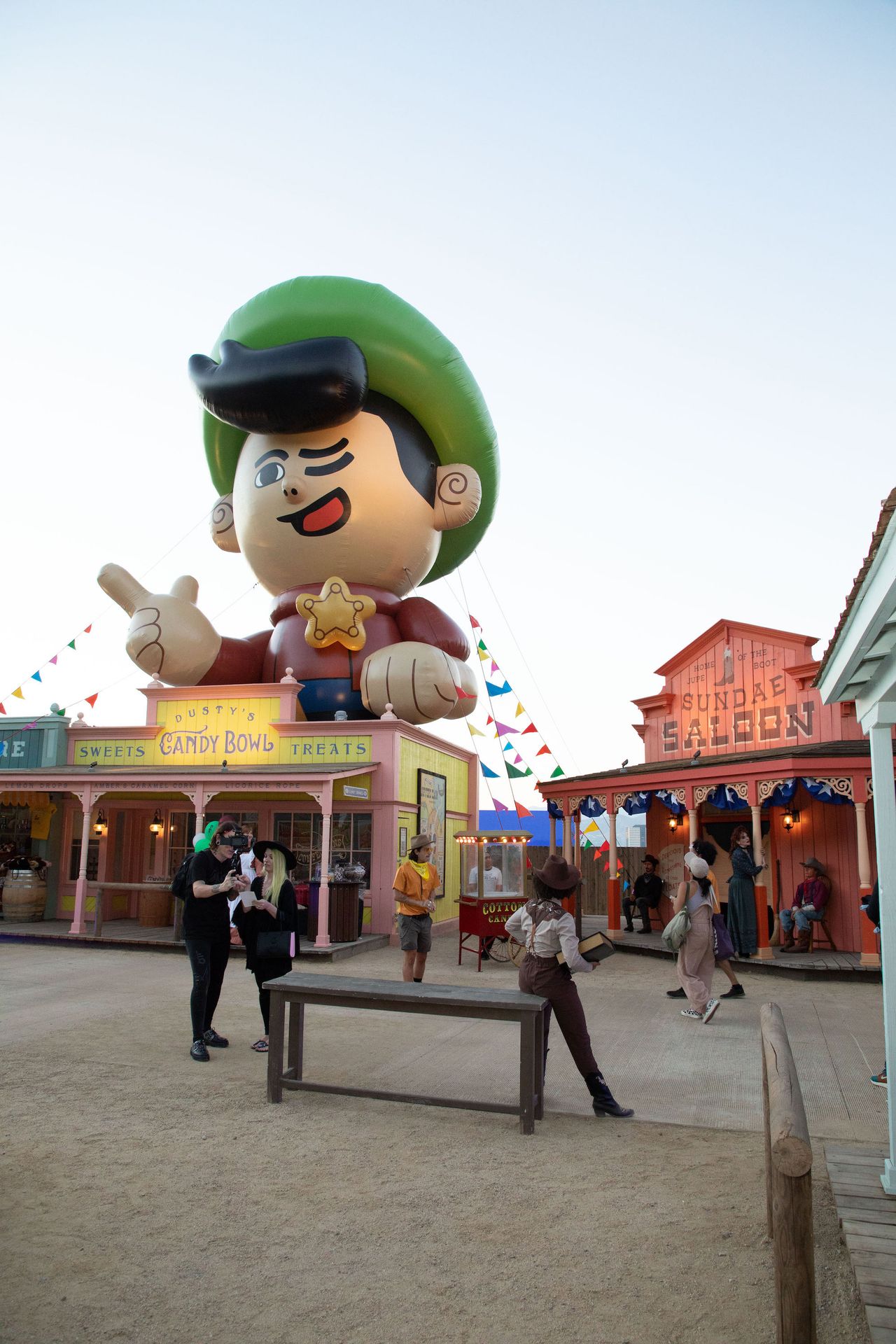 好萊塢環球影城現已搭建了片中朱庇特礦區的實景。圖片來源:本·施米克勒/AB Images for Universal Pictures《不》中由前童星(史蒂文·元飾)經營的金礦主題樂園朱庇特礦區場景,被還原在好萊塢環球影城的電車遊覽路線中。這是環球主題樂園首次實現電影IP與衍生景點的同步推出。