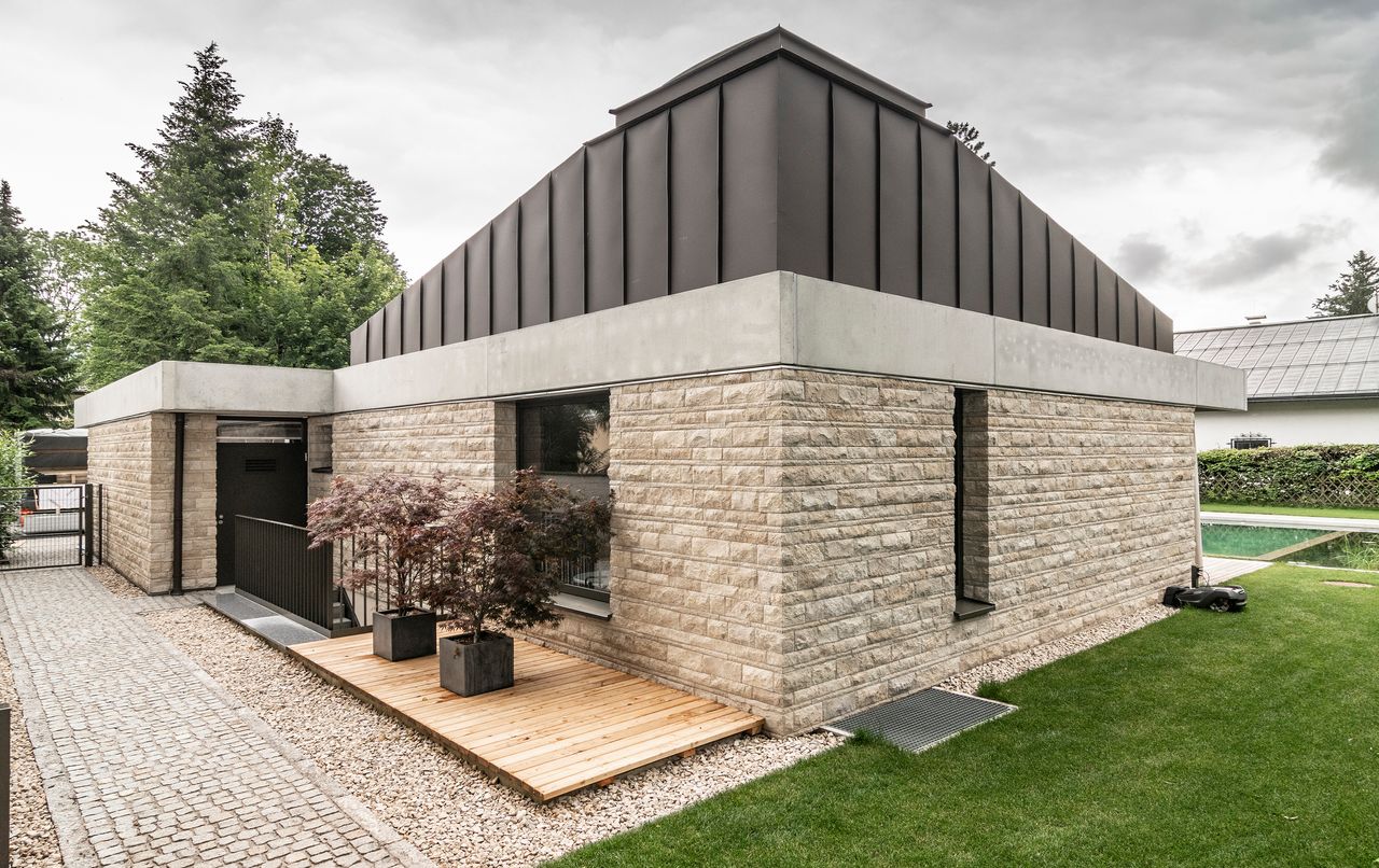 建築外立面採用德國進口石灰岩。圖片來源:托比亞斯·克賴塞爾薩爾茨堡冬季依然多雪,但夏季愈發悶熱。羅德里格斯·帕拉哈先生表示,户外泳池已成為當地新建住宅標配,格魯伯家選擇了池塘與泳池結合的設計,非使用季無需遮蓋。夏季植物淨化水質,冬季結冰的池塘成為景觀裝飾,壁爐則為室內增添温馨。