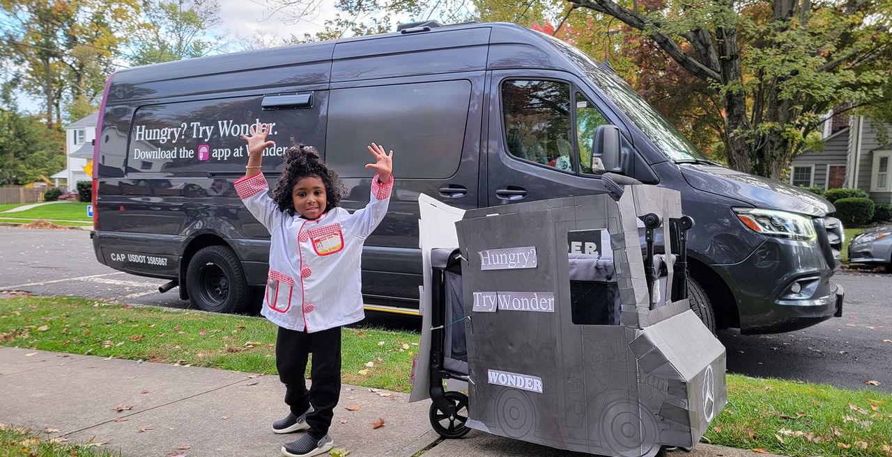 基蘭·查爾斯穿着Wonder萬聖節服裝,站在新澤西州西田社區一輛真實的Wonder貨車旁。圖片來源:羅什尼·查爾斯在西田鎮——Wonder公司2020年的發源地,私募股權公司税務總監羅什尼·查爾斯的兩個兒子(4歲和2歲)從扮演廚師"轉行"扮演Wonder卡車。去年萬聖節,查爾斯女士用噴繪成Wonder標誌色的手推車和紙板製作了一輛Wonder卡車。大兒子在討糖途中遇到真車時,還在車前擺拍了照片。