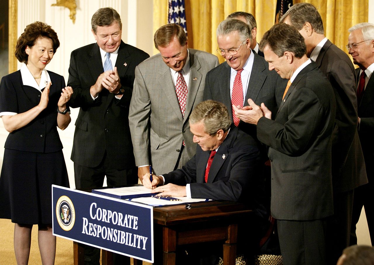 2002年7月30日,總統喬治·W·布什簽署了《薩班斯-奧克斯利法案》。該法案在參議院以99比0的票數獲得通過,在眾議院以423比3的票數獲得通過,只有佐治亞州的共和黨眾議員麥克·柯林斯、亞利桑那州的傑夫·弗萊克和德克薩斯州的羅恩·保羅投了反對票。在安然和世通公司醜聞之後,該法案被譽為打擊大公司會計欺詐的一種方法。