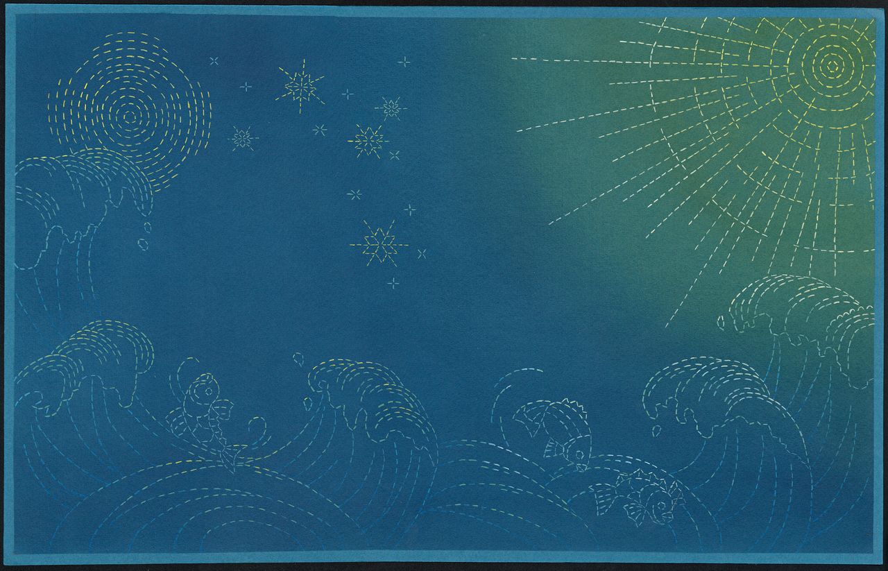 芭芭拉·西萊蒂通過一位虛構的古代敍述者——生活在刺子繡發源地淡路島的少女——娓娓道來這項工藝的發展。這個孩子用樸實的語言向6-10歲讀者解釋:寒冬裏父親和其他漁民飽受嚴寒折磨:“他們駕着空船歸來,單薄的布衣根本擋不住刺骨寒風。“飢寒交迫之下必須採取行動。女孩看着母親開始工作:“一件、兩件、三件衣服疊在一起。她的長針帶着白棉線穿梭在夏日海濤般湛藍的布料間。“插畫家瑪麗亞·克里斯蒂娜·普里泰利用柔和瑩潤的畫面再現刺子繡之美;她筆下白浪翻湧的冰海中漁夫的身影,還透出幾分葛飾北齋的神韻。《刺子繡》的獨特不僅在於主題(你上次見到關於刺繡的童書是什麼時候?),更在於其藝術感染力。