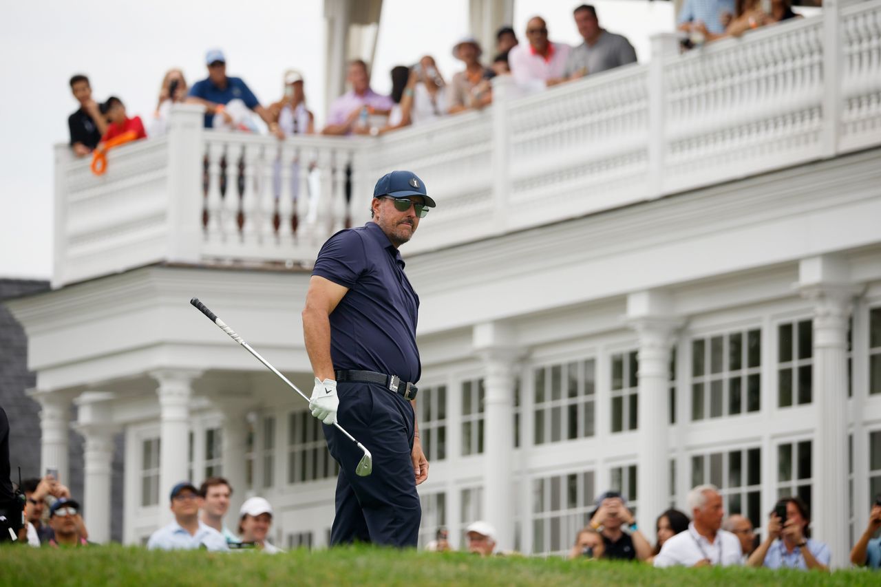 菲爾·米克爾森在特朗普國家高爾夫俱樂部貝德明斯特站第16洞發球台。圖片來源:Cliff Hawkins/Getty Images與此同時,高爾夫比賽本身並不算激烈——賽事首日,廣闊的球場內觀眾稀疏。週六場次的門票在stubhub.com上最低僅售1美元。