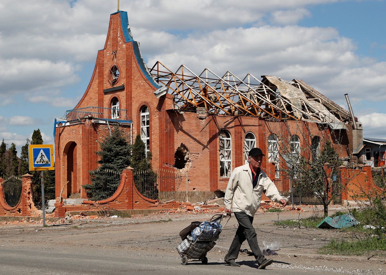 四月,被圍困城市馬裏烏波爾一座教堂的殘骸。圖片來源:ALEXANDER ERMOCHENKO/REUTERS"在俄羅斯主導的世界裏沒有我們的容身之處,“烏克蘭東正教會頓涅茨克和盧甘斯克教區主教謝爾吉·霍羅布佐夫表示。這兩個地區已基本被俄軍佔領。霍羅布佐夫主教稱,他於三月馬裏烏波爾淪陷前放棄了自己的教區辦公室,通過偽裝成音樂家混過了俄軍檢查站。