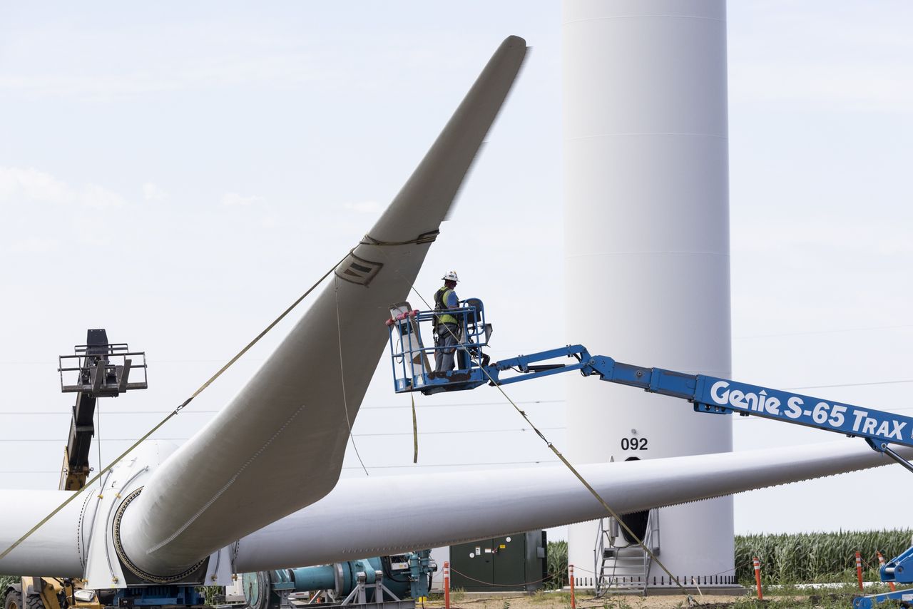 一名工人在明尼蘇達州雷丁市的風電場檢查轉子葉片。新提出的立法將有助於此類風電場的建設。圖片來源:Tim Gruber/《華爾街日報》上週與曼欽先生達成的部分共識還解決了另一個問題:新能源項目的建設延誤。另一項法案可能通過加快環境許可流程來加速這些項目。這些延誤使得填補老舊發電廠關閉留下的缺口變得具有挑戰性。