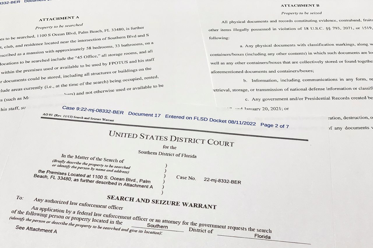 聯邦調查局對前總統唐納德·特朗普位於棕櫚灘的海湖莊園解封的搜查令。圖片來源:喬恩·埃爾斯維克/美聯社刊登於2022年8月13日印刷版,標題為《海湖莊園的秘密》。