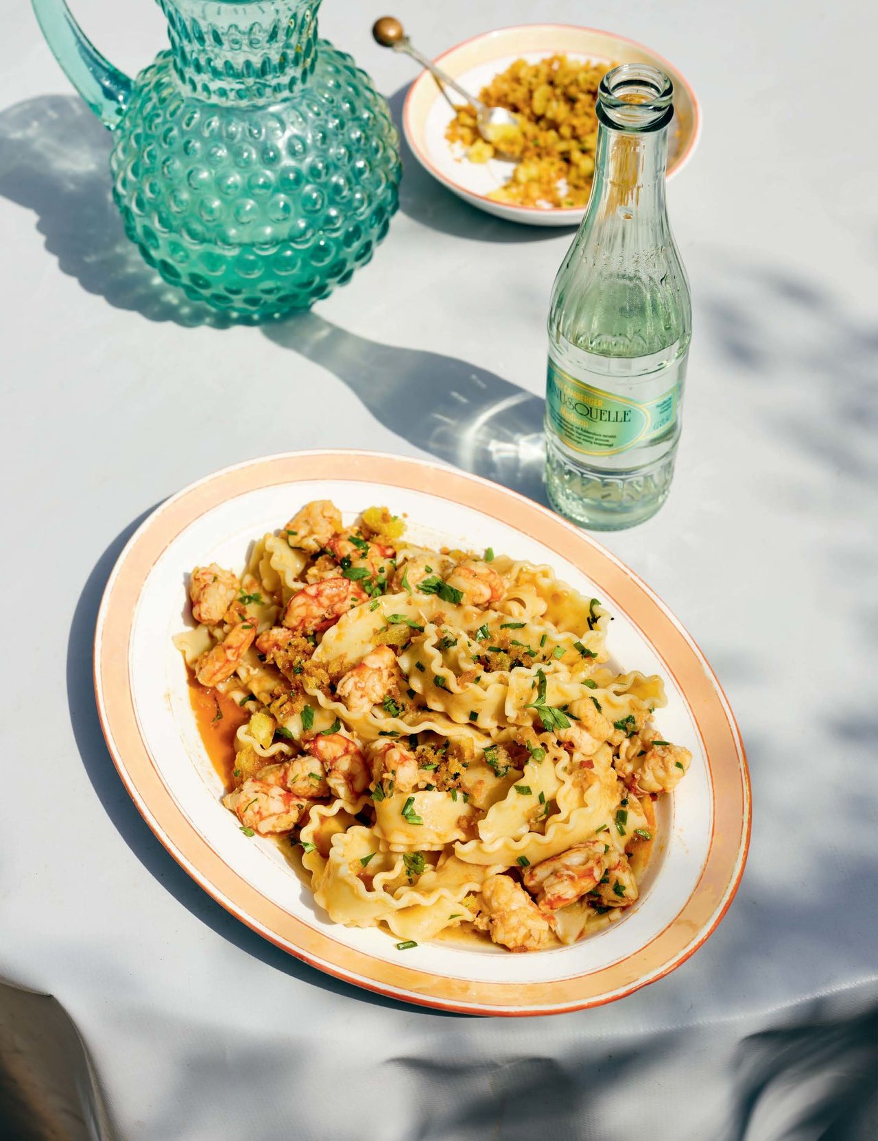 波浪紋的意大利麪讓蒜香馬法爾迪尼中的蝦仁與醬汁完美包裹每一口。下方附食譜。攝影:Graydon + Herriott,食物造型:Rebecca Jurkevich,道具造型:Amy Wilson為什麼選擇意大利麪?因為它純粹是快樂的源泉。是令人愉悦的享受。是幾乎零成本的慰藉。