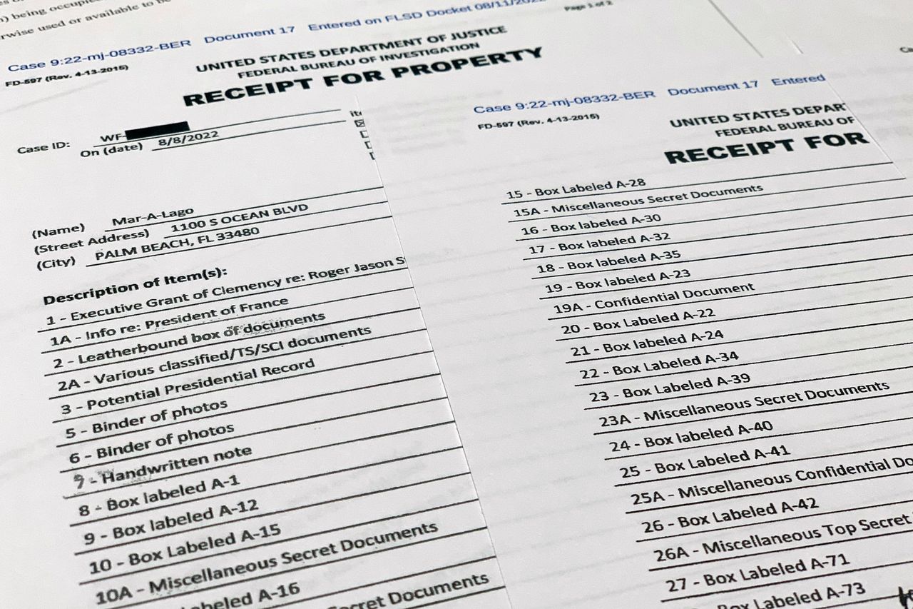 聯邦調查局在海湖莊園執行搜查令時查獲的收據。圖片來源:喬恩·埃爾斯維克/美聯社“美國公眾在信息不足的情況下運作,”阿肯色州共和黨州長阿薩·哈欽森週日在美國有線電視新聞網(CNN)上説。“我認為我們都必須深吸一口氣,説我們必須等待事實的公佈。”