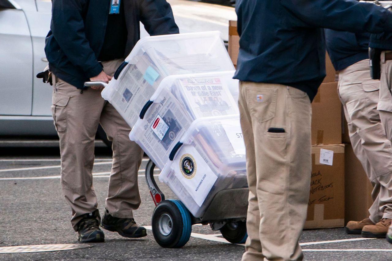 特朗普政府末期,艾森豪威爾行政辦公樓外堆放的箱子。圖片來源:埃林·斯科特/路透社這種倉促混亂的白宮撤離方式,如今成為聯邦調查特朗普離任後處理機密文件及其他總統材料的核心焦點。