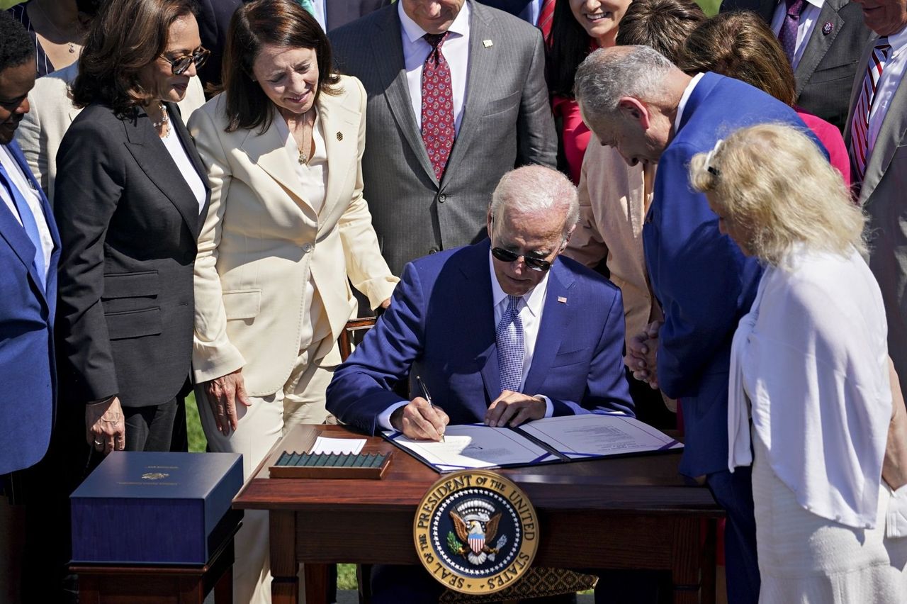 喬·拜登總統於8月9日在白宮南草坪簽署《芯片與科學法案》。照片:阿爾·德拉戈/彭博新聞刊登於2022年8月15日印刷版,標題為《半導體騙局》。