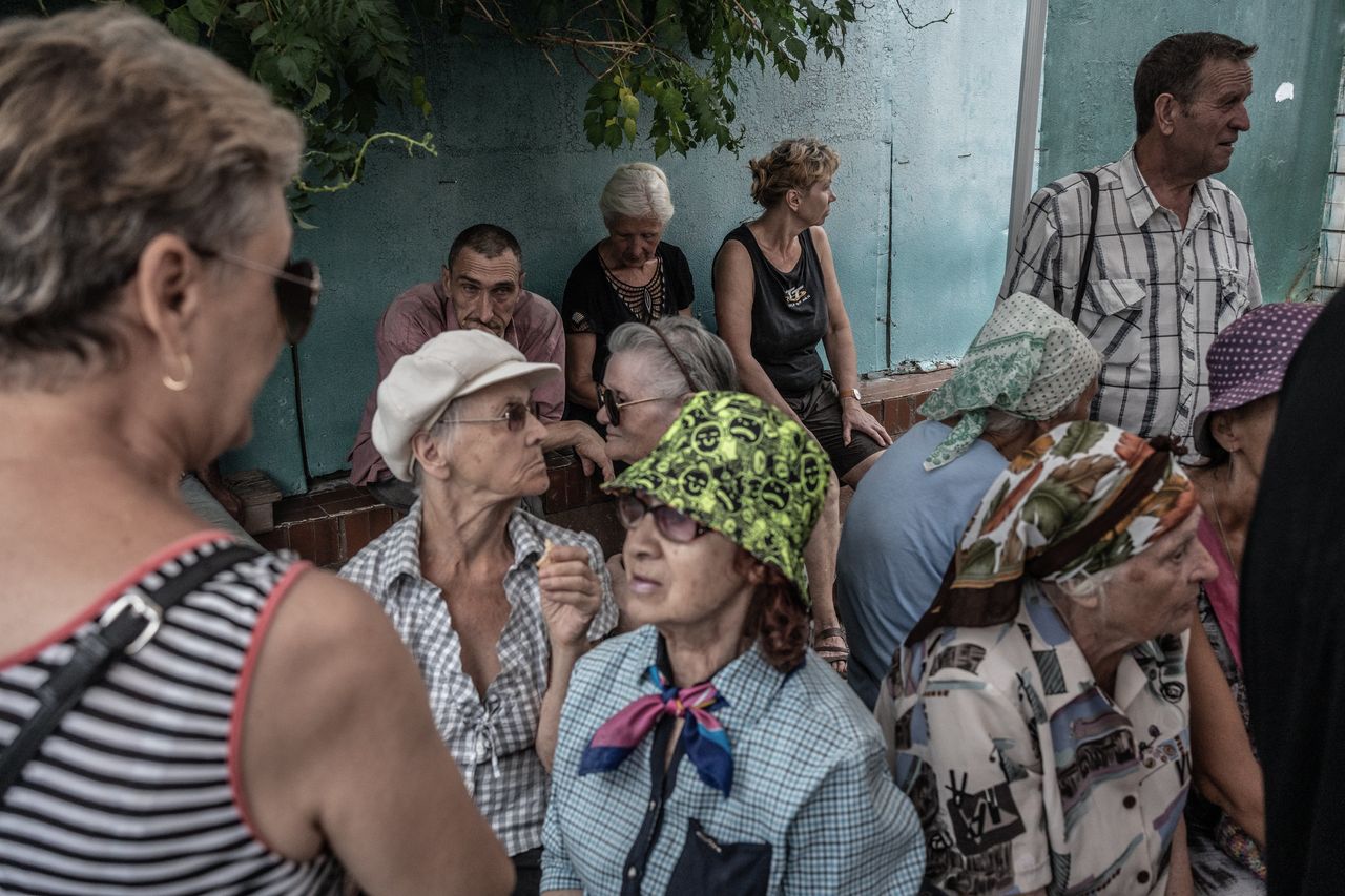 烏克蘭尼古拉耶夫居民等待領取食物援助。圖片來源:Serhii Korovayny/華爾街日報