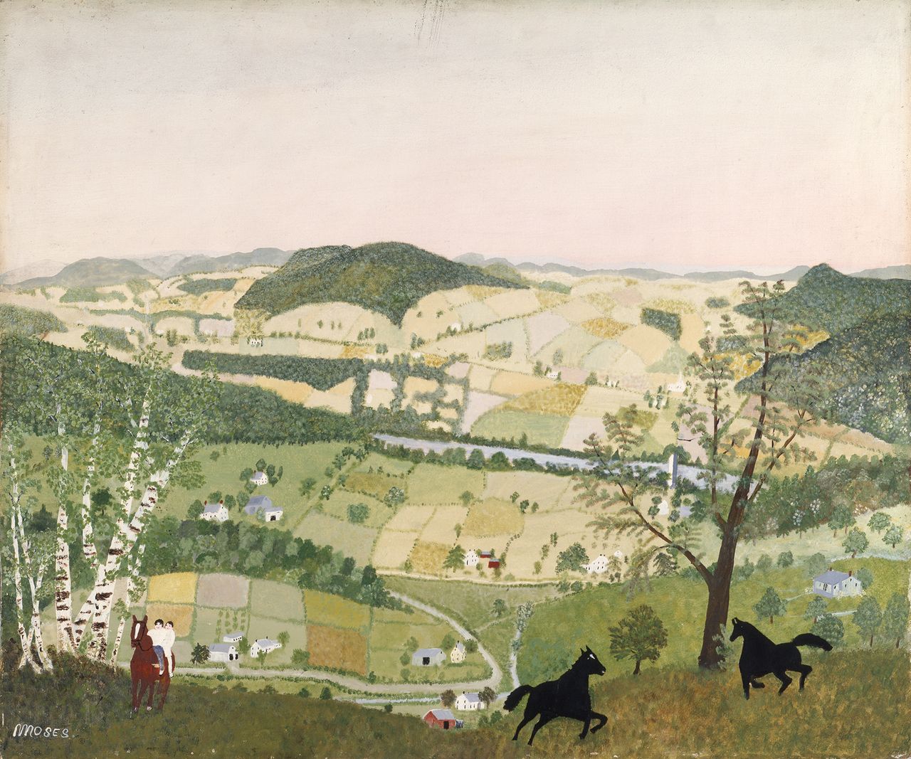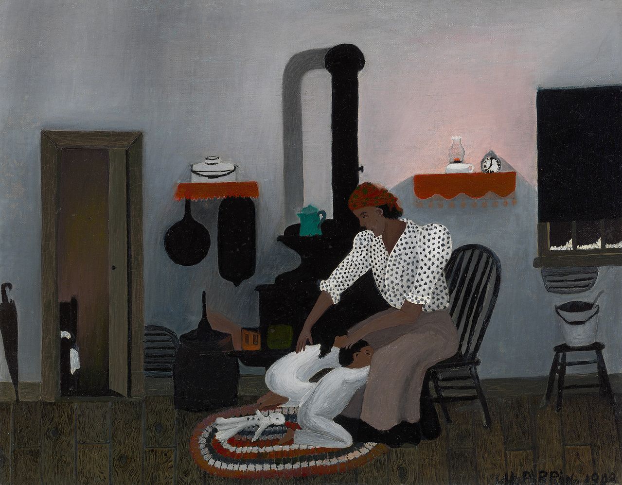 相較於皮平的政治鋒芒、原始主義與多樣性,凱恩更為傳統的畫作雖偶顯細節繁瑣,卻始終保持着更清晰的空間層次與光線處理。 凱恩的《山巒與河流,沉睡谷的汽船》(1929)和《拉里默大道橋》(1932)以令人信服的寧靜感向遠方延展。但摩西奶奶才是焦點所在。兩幅描繪雪蘭多山谷的豎幅油畫彷彿浸潤在濕潤甜美的光線中。其1942年作品《黑馬》同樣如此,將人物、馬匹與農田巧妙拼綴成精緻的百衲被圖案。在《熬糖時節》(1943)中,喧鬧的村莊生活被鐫刻在白雪與淡藍天空構成的明亮背景上。其他亮點包括約瑟芬·喬伊的《水鳥築巢》(約1935-39);卡洛斯·戴爾空間感強烈的《魚罐頭廠》(1937);帕特里克·J·沙利文熾烈的木景畫《狩獵之行》(1940);帕齊·桑託洶湧的海景《無題(奧甘奎特海岸)》(約1946);以及雅各布·勞倫斯立體主義風格的《無題(縫紉女子)》(1964)。