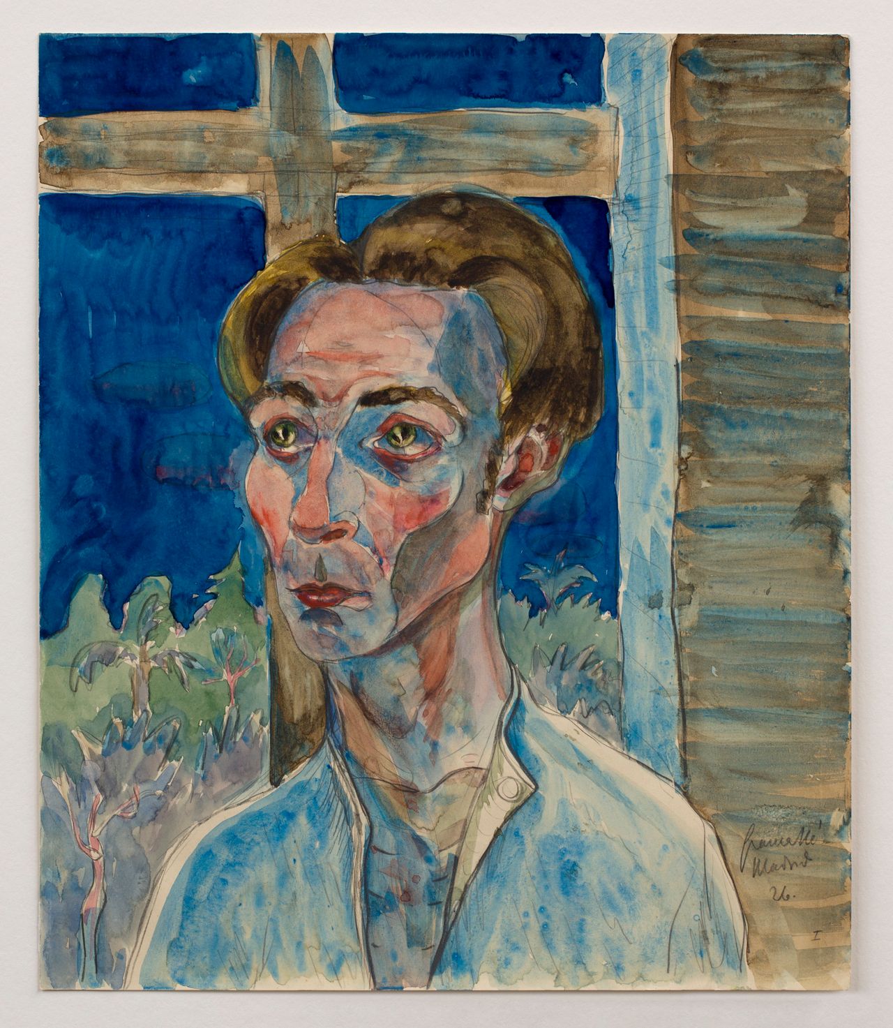 至於貝克曼的自畫像,它們與沃爾特·格拉馬特1926年用水彩和石墨繪製的自畫像產生了共鳴。兩位藝術家在描繪自己時都毫不留情,格拉馬特消瘦的面容展現了他一戰後與肺結核的鬥爭。三年後他便離世。這幅水彩畫題為《我與窗框十字架》,暗示畫中的窗户具有宗教寓意。