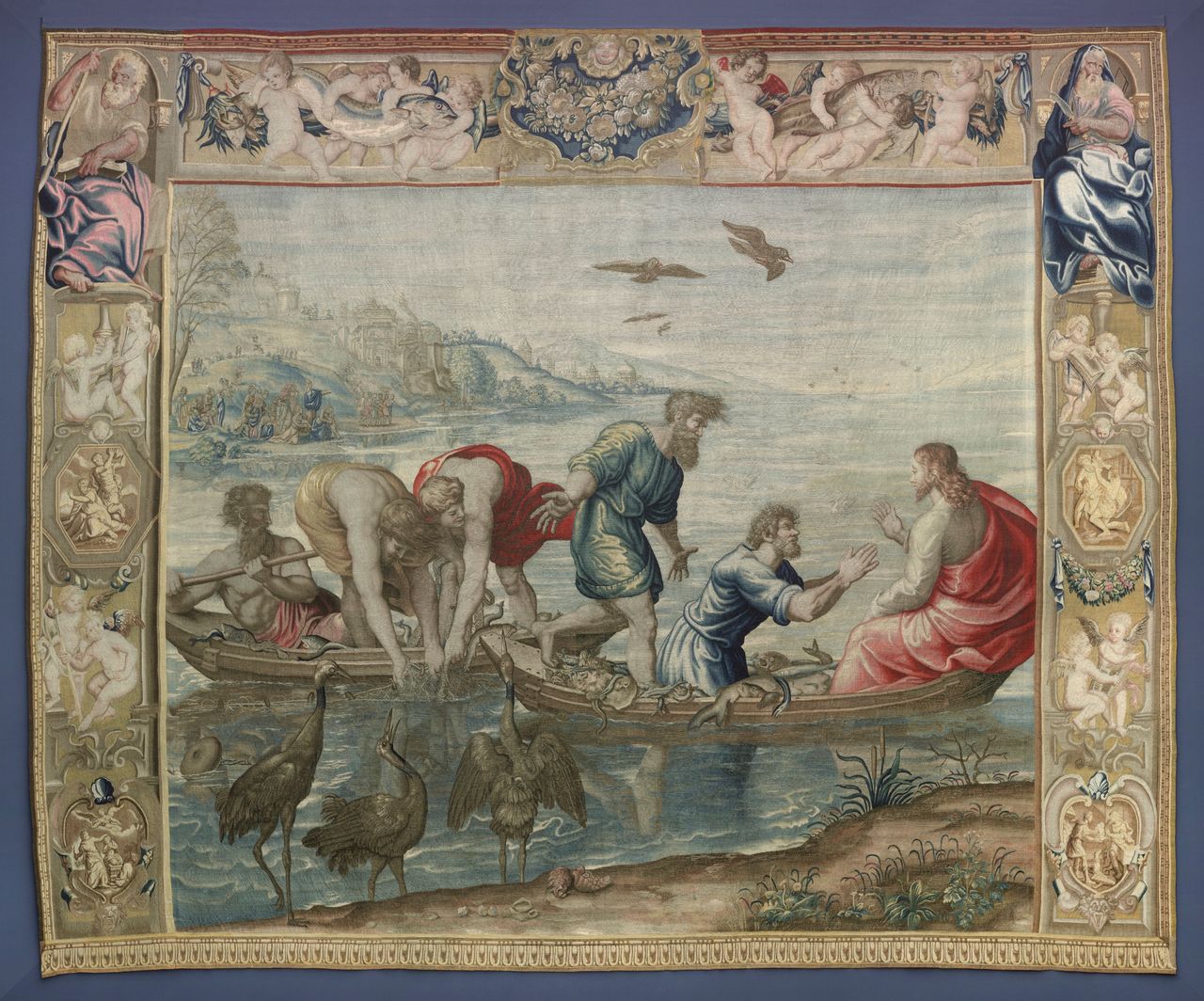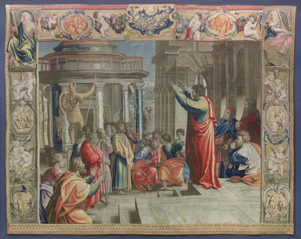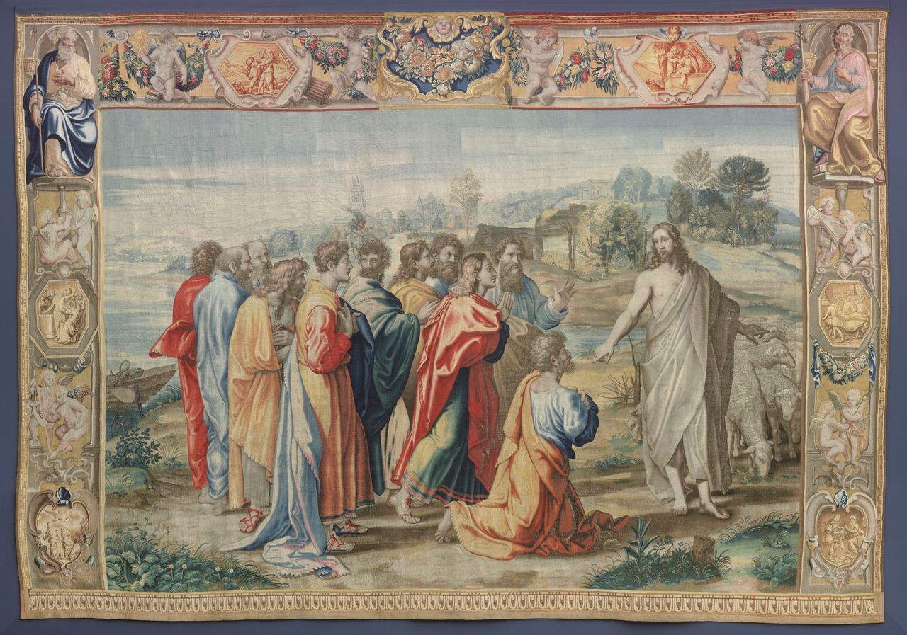 這套由教皇利奧十世於1514年左右委託製作的掛毯包含兩個系列,分別以使徒彼得和保羅為主題。拉斐爾先創作了等比例彩色底圖(稱為卡通稿),隨後送往佛蘭德斯的彼得·範·阿爾斯特工坊。十幅中有七幅在拉斐爾生前完成,並於1519年送回羅馬西斯廷教堂展出,剩餘三幅於1521年前交付。1623年,拉斐爾的掛毯底圖在熱那亞重現,被後來的查理一世購得用於倫敦附近莫特萊克的新掛毯製作。除細微改動(如省略光環)和邊框差異外,這些掛毯基本復刻了原版。本次展出來自德累斯頓古代大師畫廊的六幅掛毯正是莫特萊克版本(該系列羅馬版本的部分作品現展於梵蒂岡博物館繪畫館,十幅掛毯曾於2020年拉斐爾逝世500週年之際在西斯廷教堂集體展出,而新修復的底圖現陳列於倫敦維多利亞與阿爾伯特博物館)。