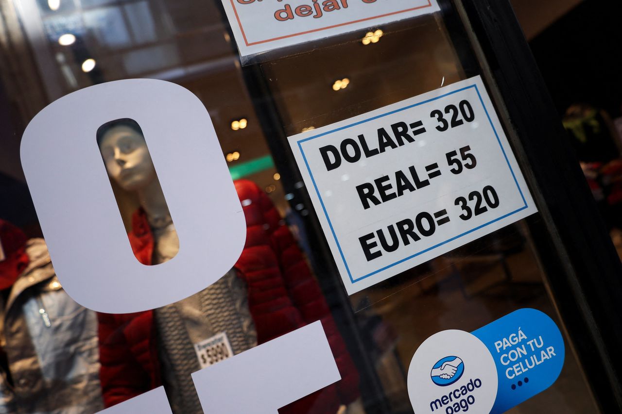 7月29日,布宜諾斯艾利斯一家服裝店外展示匯率的標牌。圖片來源:STRINGER/REUTERS刊發於2022年8月22日印刷版,標題為《阿根廷漫長的衰敗之路》。