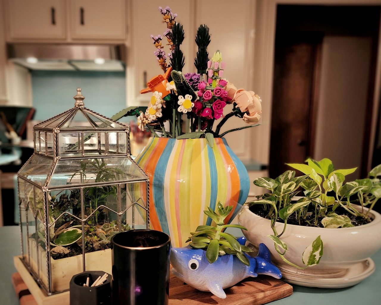 這位23歲的數字體驗專家現在擁有一棵橡膠樹、一株蘭花、一株龜背竹、一株蕨類植物、幾株多肉植物、一束鮮花和一盆盆景。其中約一半是真的,另一半則是樂高積木拼成的。