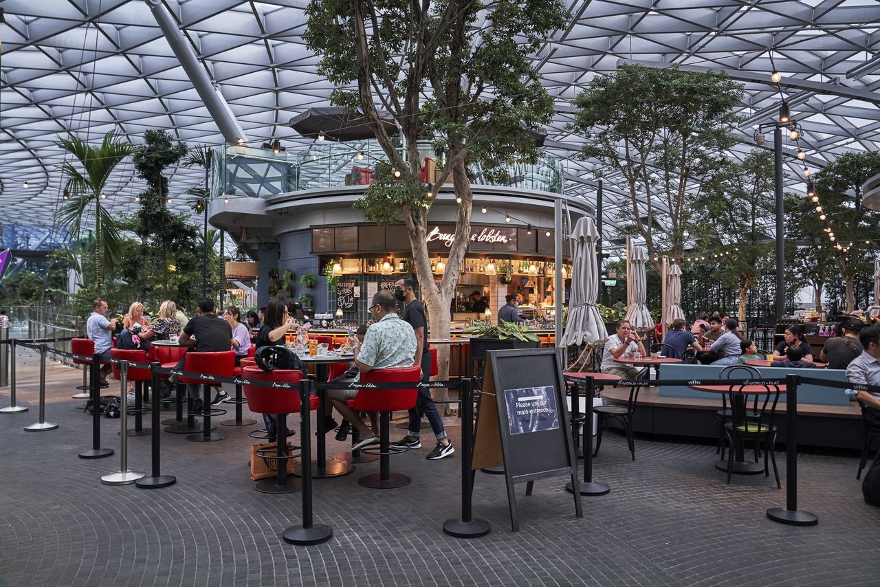 新加坡星耀樟宜機場商場的用餐者。圖片來源:Lauryn Ishak/Bloomberg News新加坡——由於私人交通和住宿成本上升以及核心通脹加速,新加坡7月份消費者價格指數創下14年來最快漲幅。