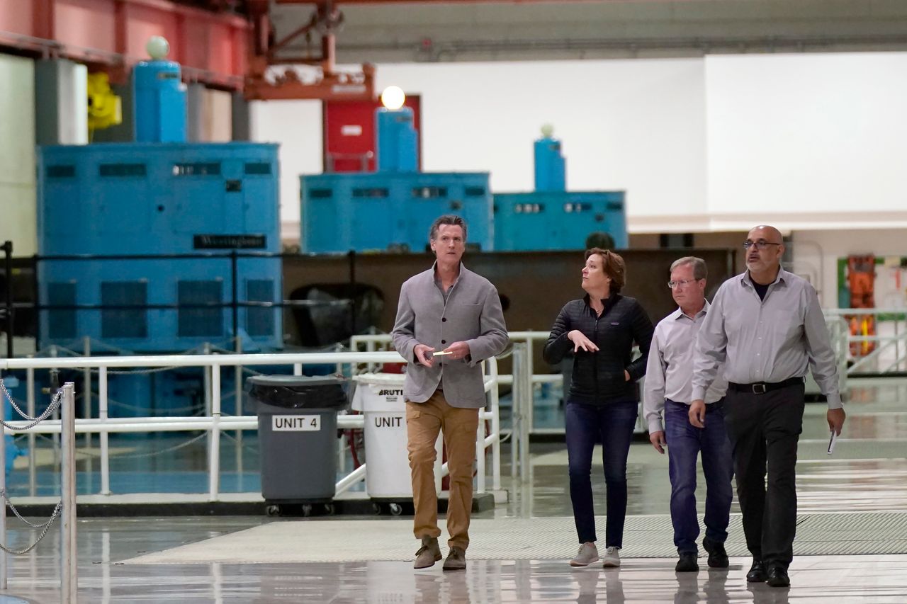 州長加文·紐森(穿西裝外套者)於四月參觀加州奧羅維爾的一座水力發電設施。圖片來源:Rich Pedroncelli/美聯社尚未提交的擬議立法將推動擁有該核電站的北加州公用事業公司PG&E Corp.更新其聯邦核運營許可證,並進行其他必要工作以維持核電站運行。加州2022年立法會議將於8月31日結束,距離對該法案進行投票的時間所剩無幾。
