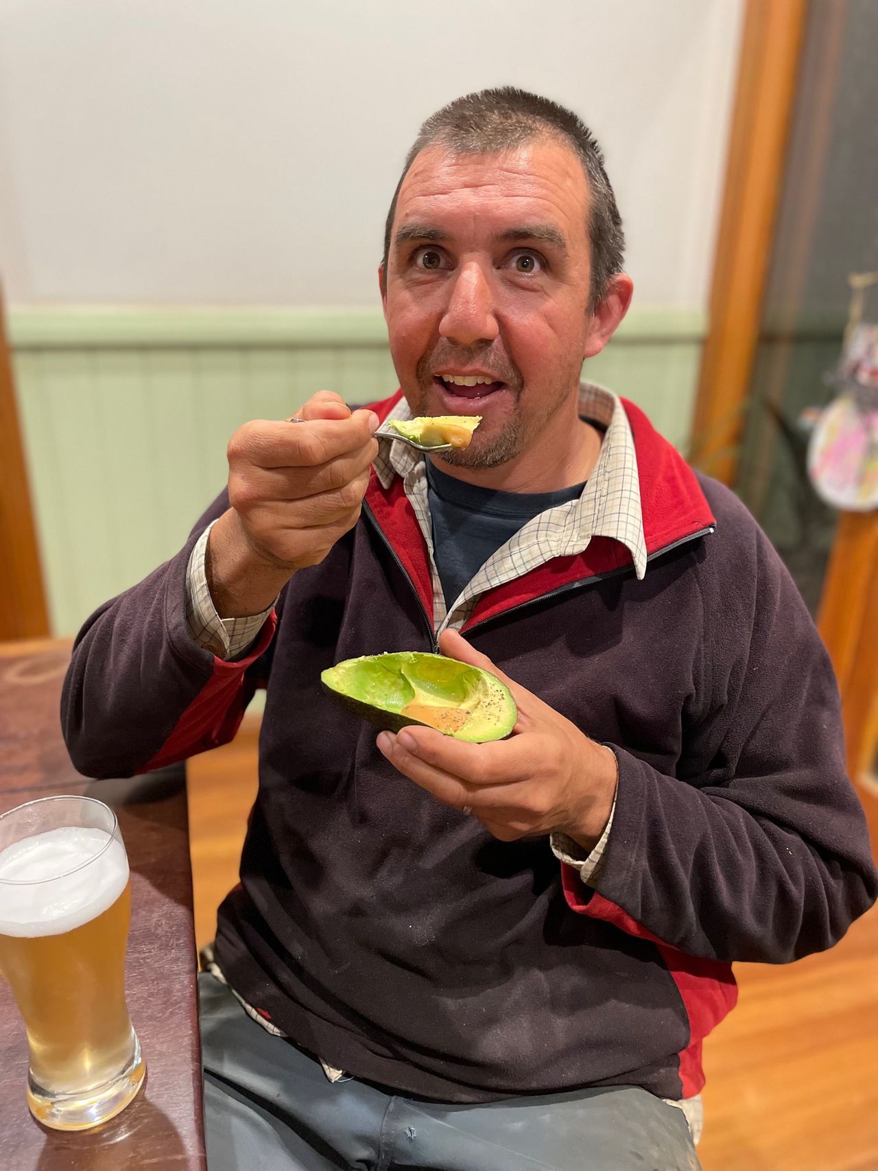 湯姆·西爾弗享用最愛的零食:牛油果配啤酒。圖片來源:湯姆·西爾弗在本地推廣方面,喜歡用啤酒吃牛油果的種植者湯姆·西爾弗表示,他一直試圖説服咖啡館和餐廳客户銷售在部分東南亞國家流行的牛油果奶昔。