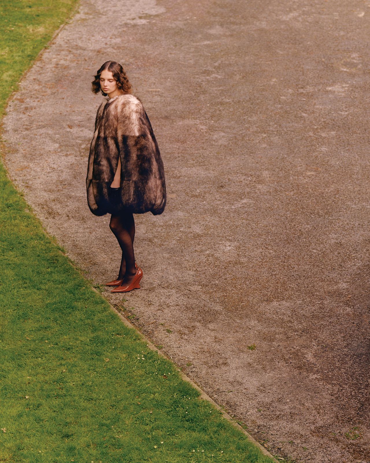 一件仿皮草泡泡斗篷為晚裝增添活力。Bottega Veneta斗篷與鞋,價格請諮詢,BottegaVeneta.com,Hedoine打底褲,39美元,Hedoine.com。