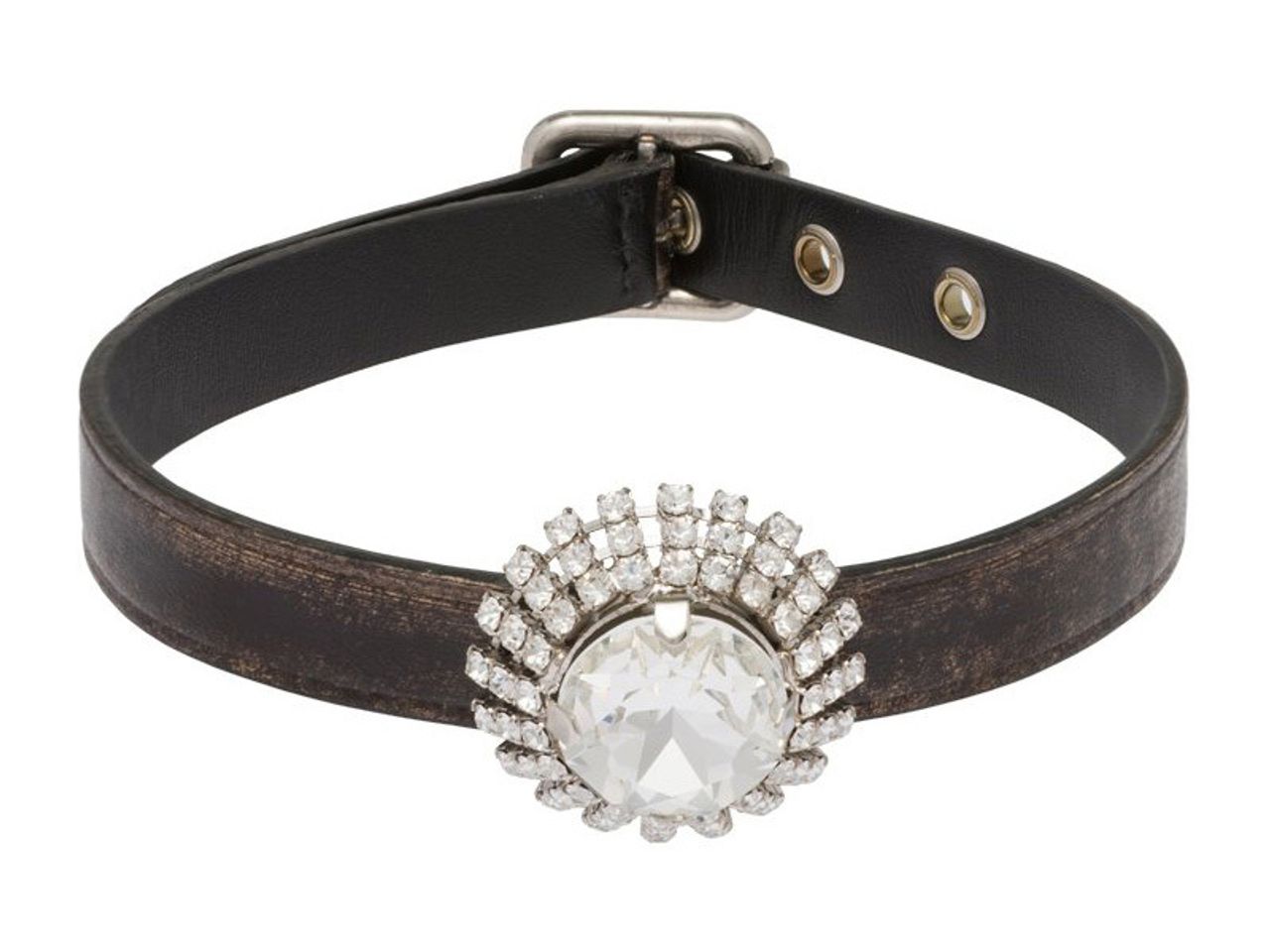 這款水晶裝飾頸鍊配有可調節皮革項圈。625美元,MiuMiu官網