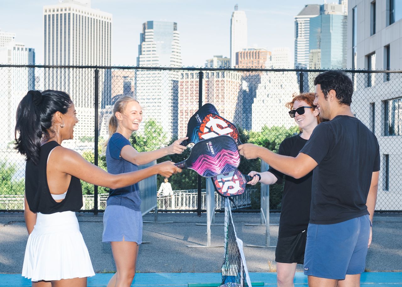 從左至右:克里西卡·瓦拉古爾、本文作者、凱爾西·沃特斯和傑克·比特爾像擊掌般輕觸球拍。作者承認這看起來有點呆。我在匹克球運動中的這種放任態度如今越來越少見。隨着萊昂納多·迪卡普里奧、卡戴珊家族和比爾·蓋茨等名人成為其擁躉,哥倫比亞廣播公司和福克斯等電視網將匹克球賽事加入節目表,全世界都開始關注這項運動。加拿大潮牌Ssense現已發售匹克球球拍,高爾夫風格服裝品牌Devereux則推出了13件套匹克球主題系列。雜誌文章紛紛冠以《匹克球能拯救美國嗎?》和《匹克球風靡背後:為何招致不滿》等標題,關於這項運動價值的爭論持續發酵。