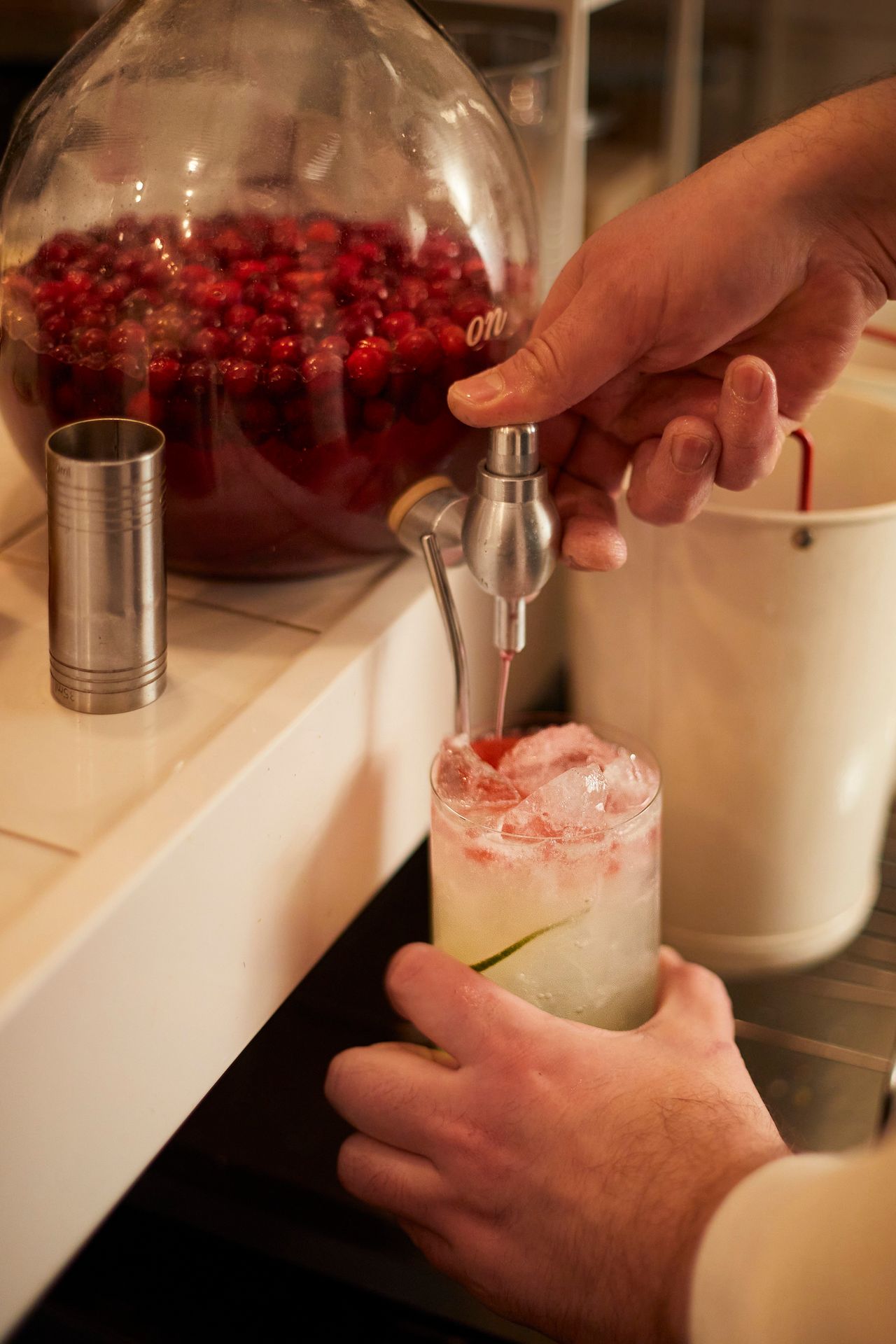 在馬德里拉瓦皮耶斯社區的巴列-因克蘭劇院轉角處,藏着一家名為薩瓦斯的温馨酒吧。紅色管道蜿蜒攀附在掛滿藝術品的白牆上,其招牌莫斯科騾子雞尾酒也因自釀蔓越莓伏特加染上一抹緋紅——這款伏特加同樣出現在酒吧的"北歐尼格羅尼"中,搭配味美思、金巴利和北歐烈酒Akvavit。
