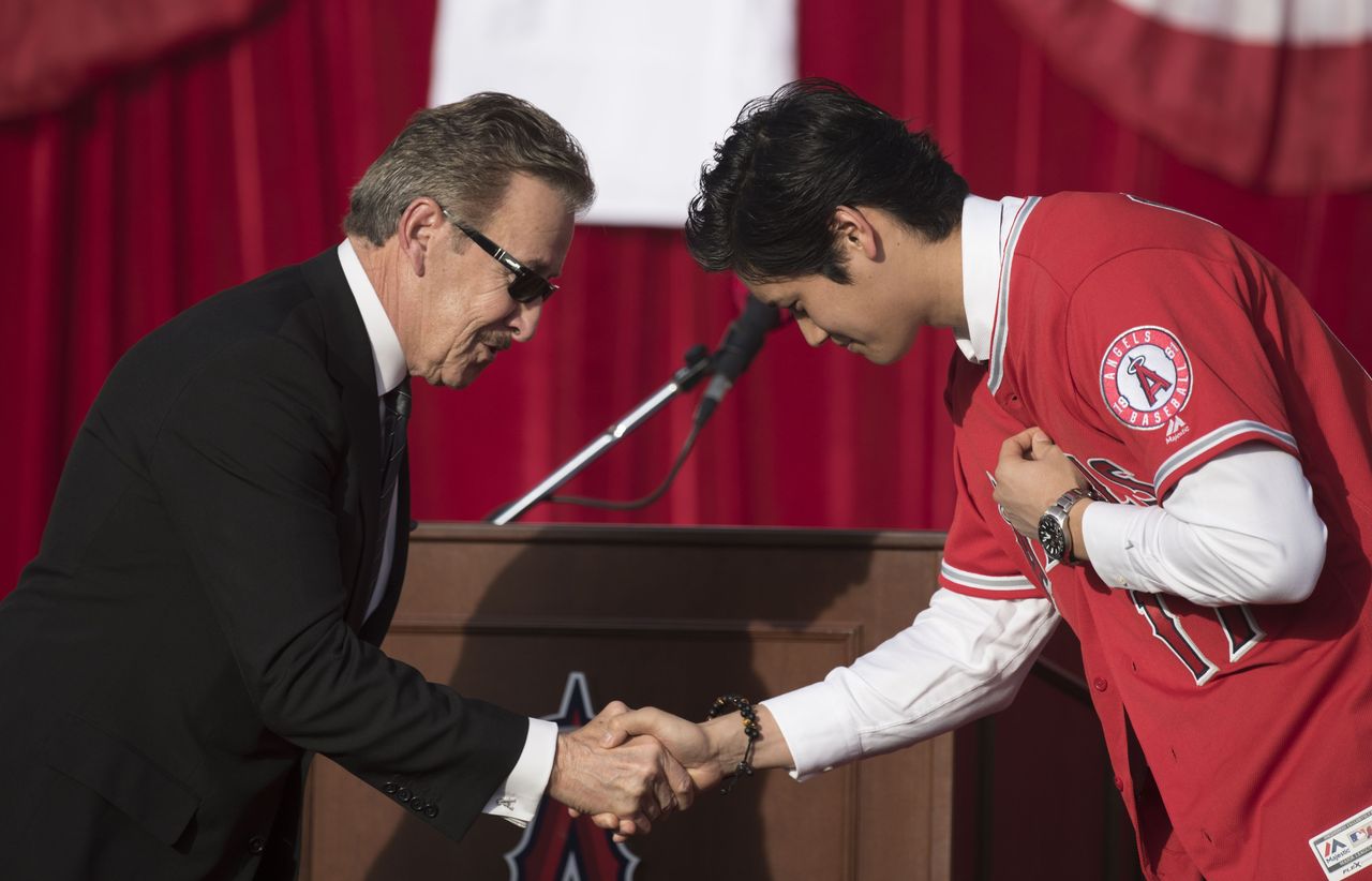 2017年記者會上,天使隊老闆阿特·莫雷諾向大谷翔平鞠躬握手。圖片來源:凱文·沙利文/Zuma Press本文刊登於2022年8月25日印刷版,標題為《揮金如土未果 天使隊掛牌出售》。