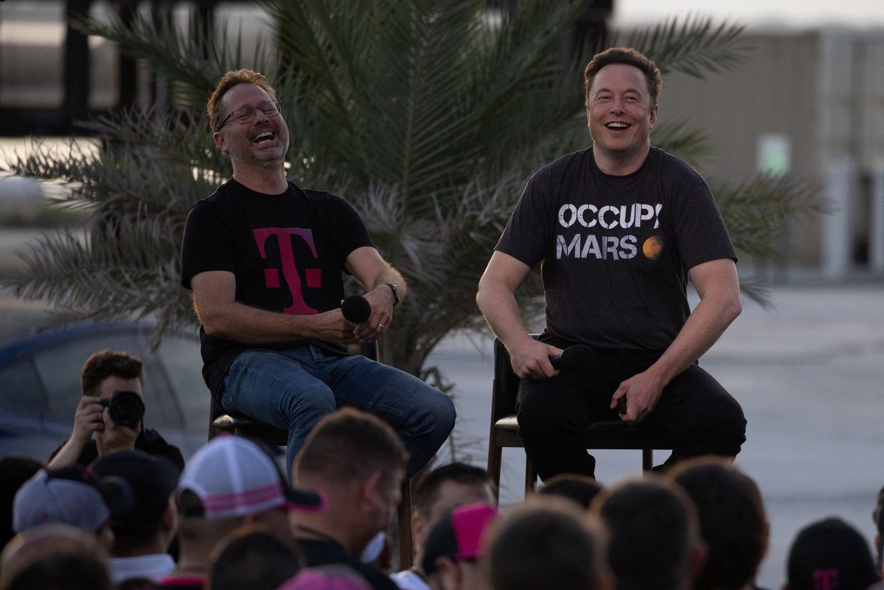 T-Mobile首席執行官邁克·西弗特與SpaceX的埃隆·馬斯克週四在德克薩斯州的一場活動中表示,他們計劃首先在選定市場測試短信服務。圖片來源:Adrees Latif/Reuters通過地面無線網絡覆蓋偏遠地區成本高昂,且付費用户稀少難以平衡支出。現有衞星電話服務通常需要配備大型天線的終端設備,並按消息或分鐘計費。