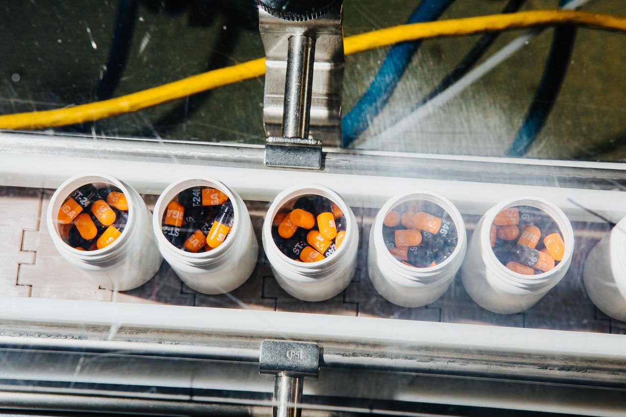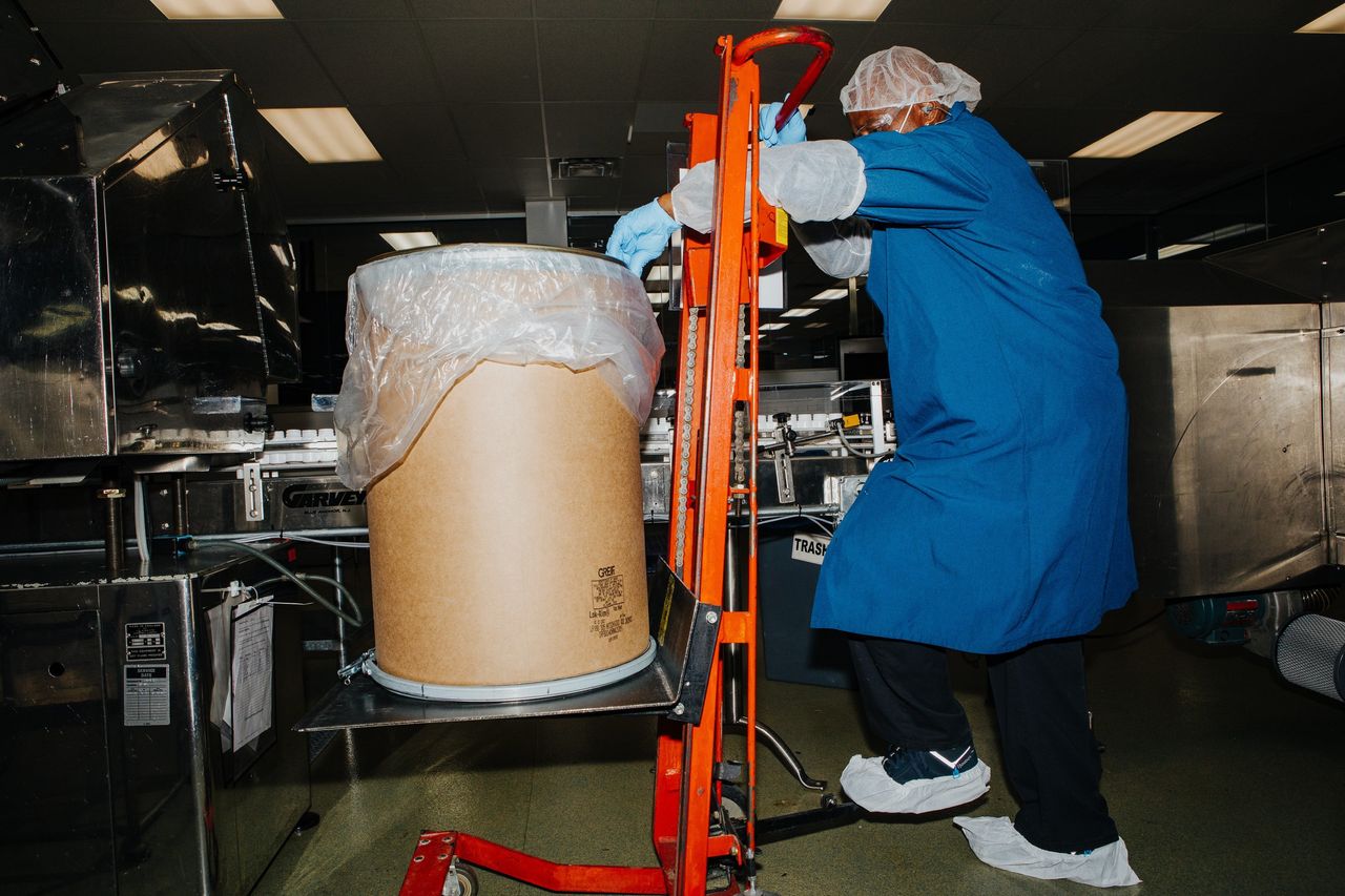 包裝協調公司費城工廠裏,一桶待分裝的Tpoxx膠囊正等待裝瓶裝箱。美國官員已批准將Tpoxx用於重症猴痘患者,動用了為防範天花疫情儲備的170萬療程藥物。拜登政府表示,本週將向地方衞生部門再提供5萬療程,此前已發放2萬療程。