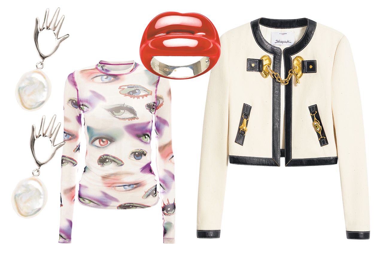 奇幻之選 從左至右:耳環,300美元,AgmesNYC.com;JW Anderson上衣,190美元,Farfetch.com;索蘭芝Hotlips戒指,285美元,Shop-US.DoverStreetMarket.com;夾克,7,800美元,Schiaparelli.com*《華爾街日報》未從文中所列零售商處收取產品推廣費用。所列零售商通常並非唯一銷售渠道。*