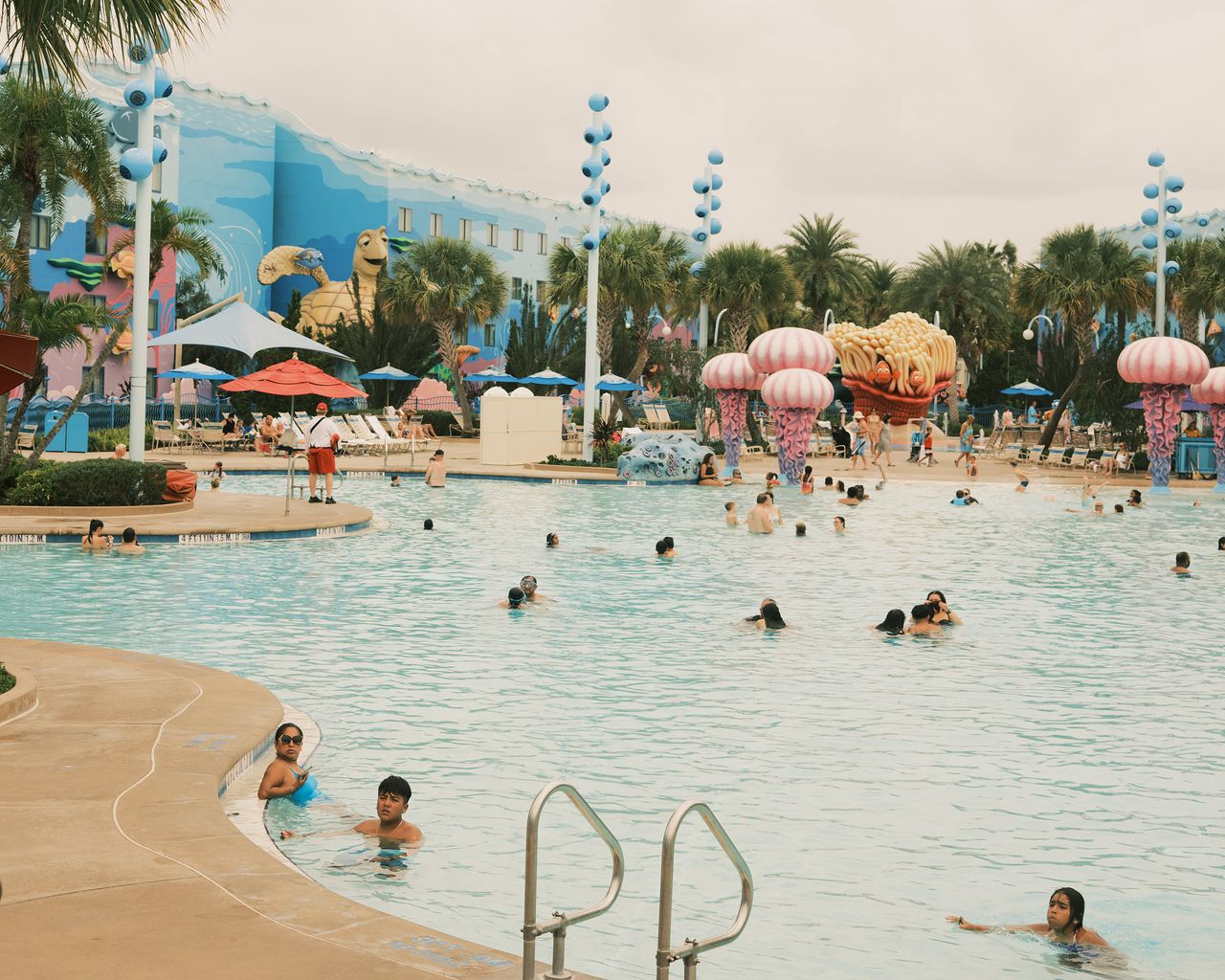 度假遊客在奧蘭多迪士尼動畫藝術度假村的泳池中消暑。餐飲:忘掉漢堡和薯條吧。華特迪士尼世界度假區內分佈着眾多高級餐廳,包括維多利亞與艾伯特餐廳——這是2021年佛羅里達州僅有的兩家獲得AAA五鑽獎的餐廳之一。其固定價格菜單每人起價295美元。(請注意餐廳可能需要提前預訂。)