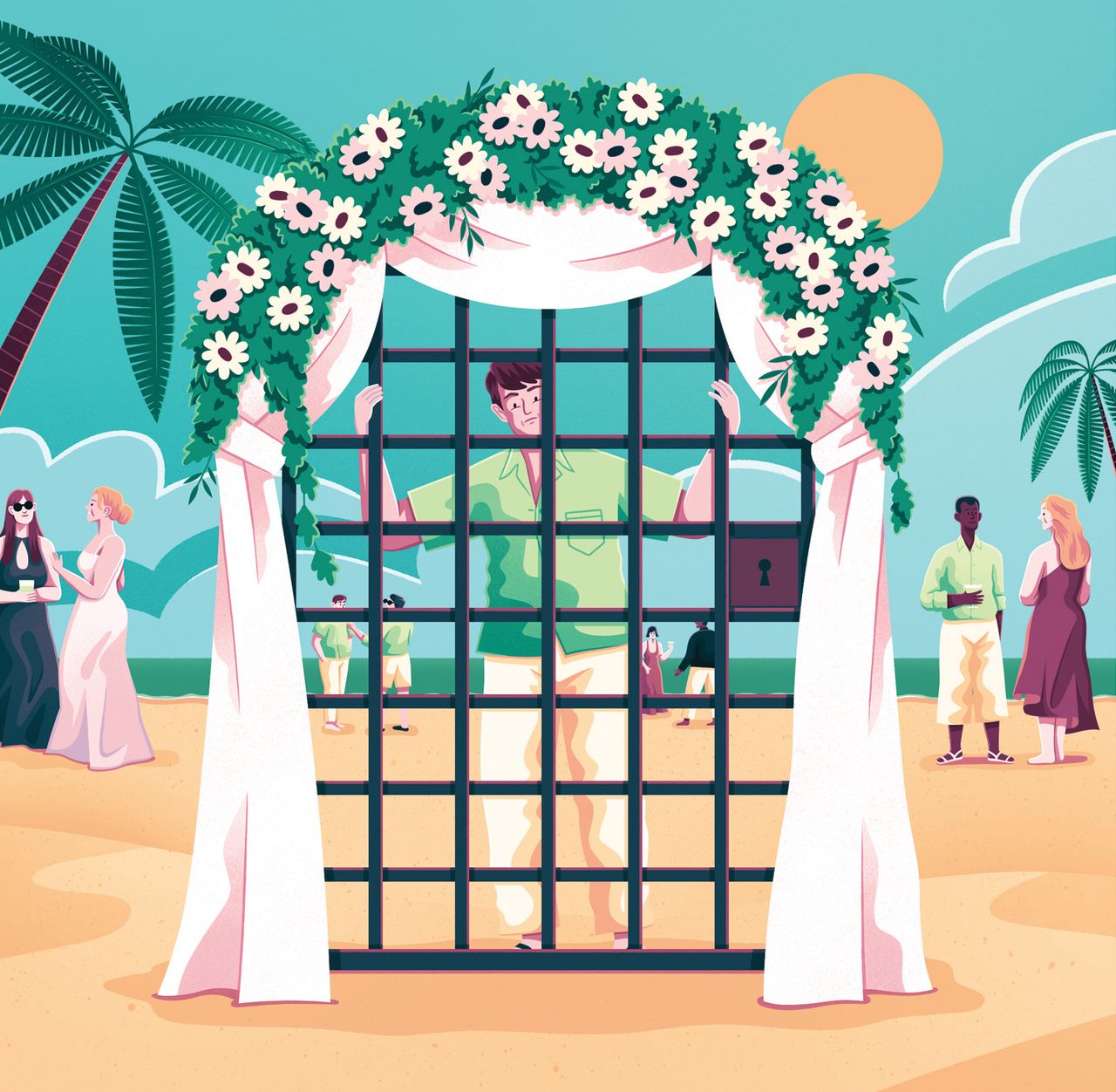 並不完美的逃離 反對目的地婚禮的人認為,這種慶祝活動更像是與不熟的人被迫同行的尷尬假期,而非浪漫之旅。插圖:雅各布·斯特德在本期"爭議焦點"系列欄目中,我們將探討當下熱門話題,並呈現兩種激烈對立的觀點——一方支持,另一方堅決反對。往期內容請點擊此處。