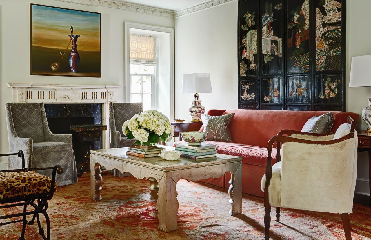 在她位於夏洛特的客户那棟20世紀30年代喬治亞復興風格住宅的客廳設計中,沃克女士通過調和兩種對立美學找到了平衡——為痴迷古董的男主人安裝了中式屏風和古舊奧沙克地毯,而為鍾情現代風的女主人則選用了仿毛絨面料包裹的貝爾熱爾扶手椅和極簡磚紅色天鵝絨沙發。