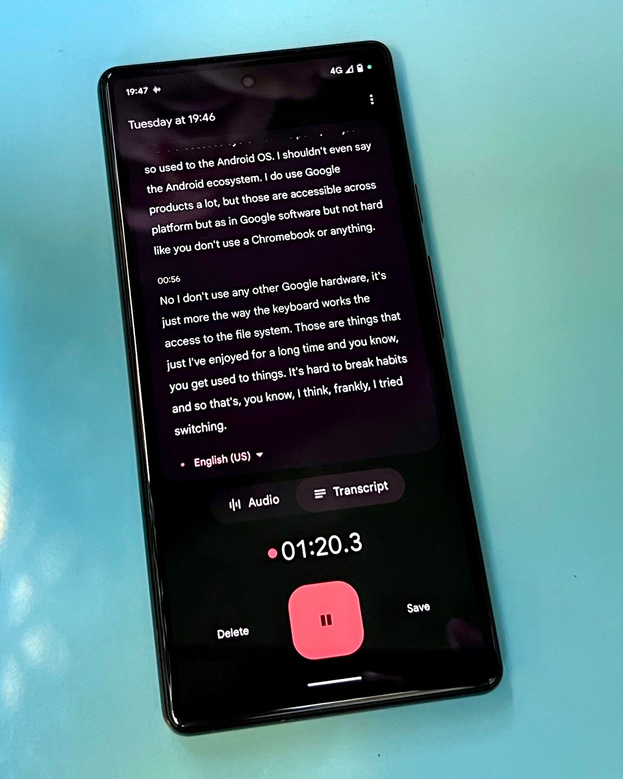 我拿起威爾的Pixel 6a,開始錄音。在我們交談時,應用即時轉錄了我們的對話,幾乎完美精確。這是我最羨慕的安卓人工智能功能之一。第二個是Hold for Me,這個工具在你等待客服代表時幫你保持通話。