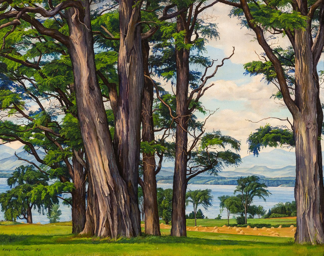 盧西奧尼,這位以户外寫生聞名的畫家,在其風景畫中再次展現了非凡才華,《斯托村》便是明證,而《大榆樹》與《穿過洋槐的湖》(1936年)等作品更將這種特質推向極致:畫面呈現出令人驚歎的景深,彷彿視野無限延伸。這歸功於他對遠方細節的細緻觀察(有時藉助觀劇望遠鏡),以及運用透明釉彩使圖像更顯鋭利。