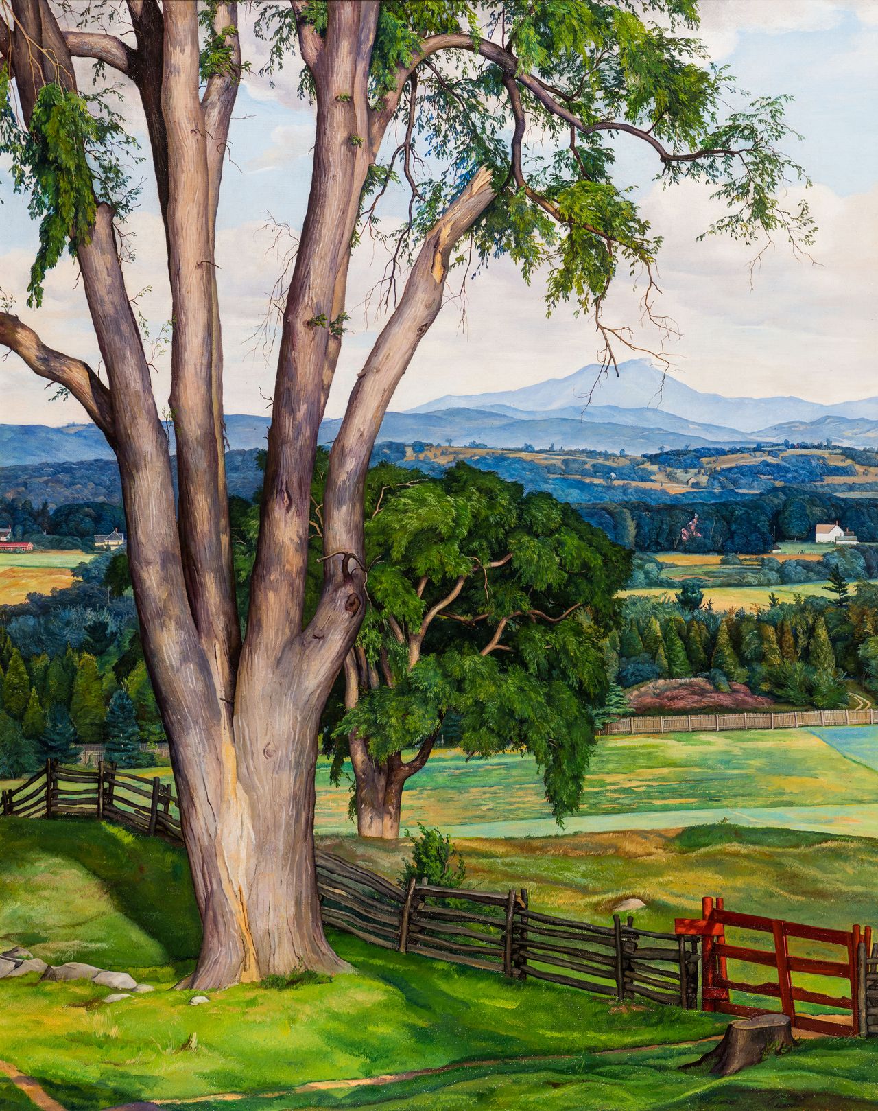 路易吉·盧喬尼《大榆樹》(1934年)圖片來源:雪爾頓博物館作為展覽開篇之作,《佛蒙特州斯托村》(1931年)堪稱典範。遠處,田園詩般的城鎮佔據畫面中心,背靠湛藍羣山,環抱緩坡綠茵。一座純白的教堂尖塔略微偏離中心,刺破構圖。這幅畫微妙地呼應了許多文藝復興作品的背景處理。