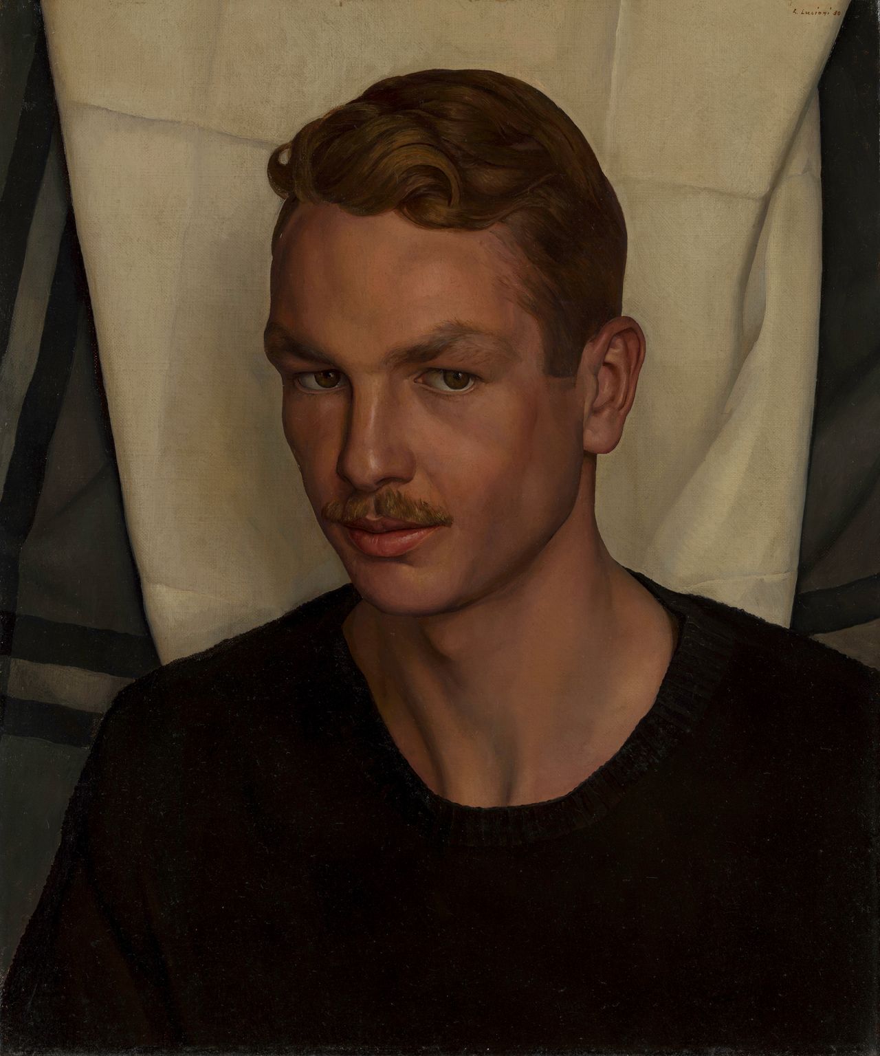 盧西奧尼的肖像畫同樣出色,儘管他晚年聲稱不喜歡此類創作。他的肖像作品通常簡潔而莊重。作為未出櫃的同性戀者,他為圈內男性友人創作了多幅藴含同性符號的畫作,如《卡德摩斯》與《賈裏德·弗倫奇》(1930年),通過修整的眉毛和性暗示的眼神傳遞隱秘信息。而像《埃塞爾·沃特斯肖像》(1939年)這類作品則更為直白——這位爵士歌手兼女演員身披紅裙光彩照人,貂皮大衣搭在身後椅背,翠綠色幕布如舞台般垂墜。她雙臂緊抱腰間,面無表情地側轉臉龐,神情警惕又似倦怠。