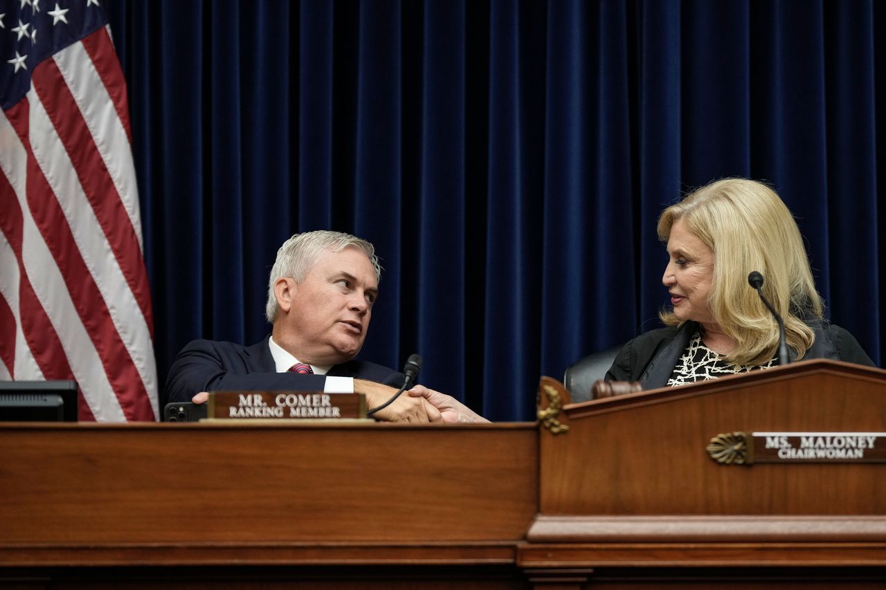 肯塔基州共和黨眾議員詹姆斯·科默和紐約州民主黨眾議員、委員會主席卡羅琳·馬洛尼在上個月的眾議院監督委員會聽證會上。圖片來源:Drew Angerer/Getty Images肯塔基州共和黨眾議員詹姆斯·科默(即將出任監督與改革委員會主席)表示亨特·拜登將成為調查重點。許多共和黨人質疑拜登在擔任副總統及總統期間,其子擔任烏克蘭能源公司布瑞斯馬董事等商業往來是否影響了美國政策。