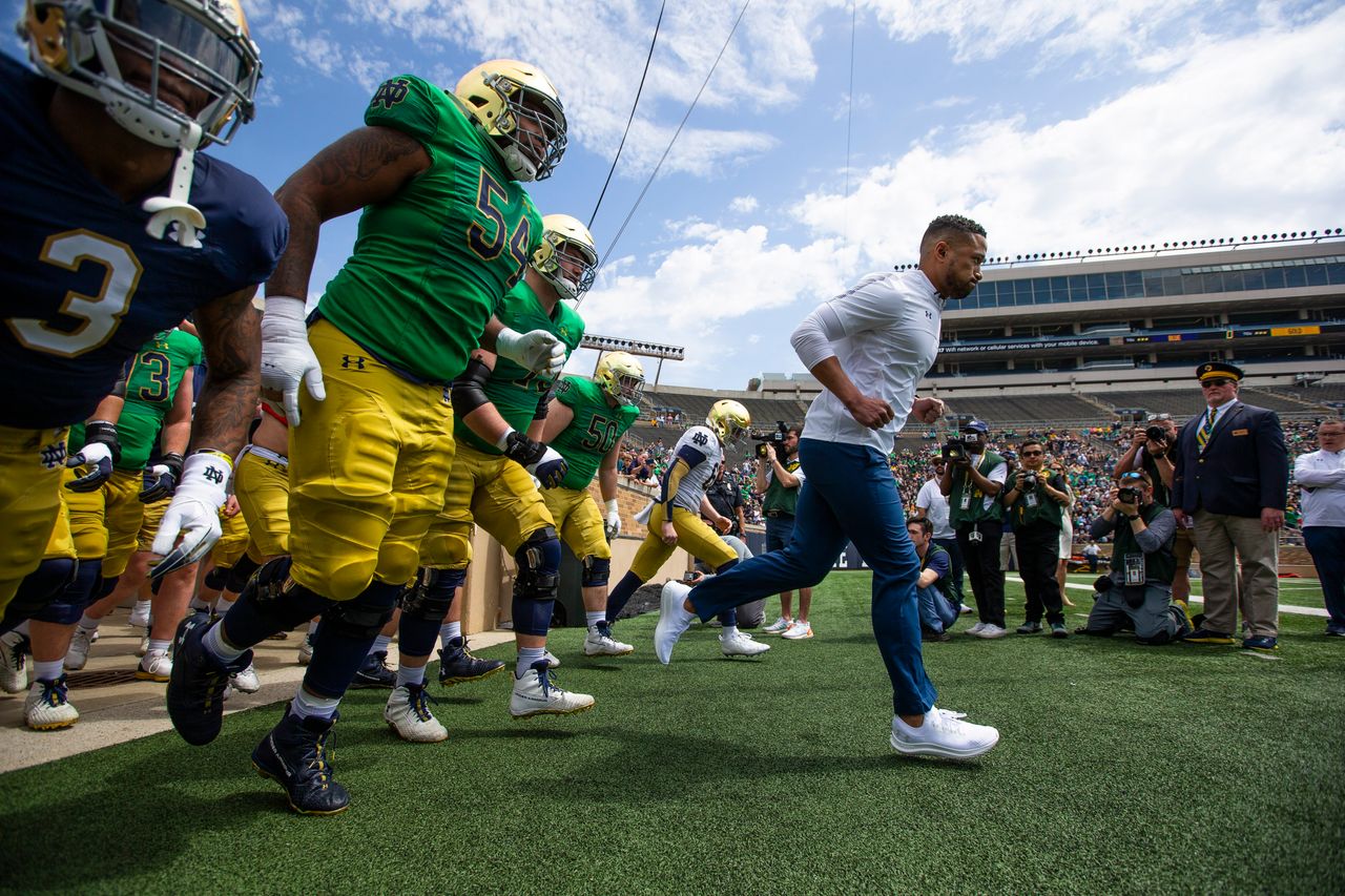馬庫斯·弗里曼在春季比賽前帶領球員走出通道。照片:邁克爾·卡特里納/美聯社刊登於2022年9月1日印刷版,標題為《聖母大學新教練的首個噩夢任務》。