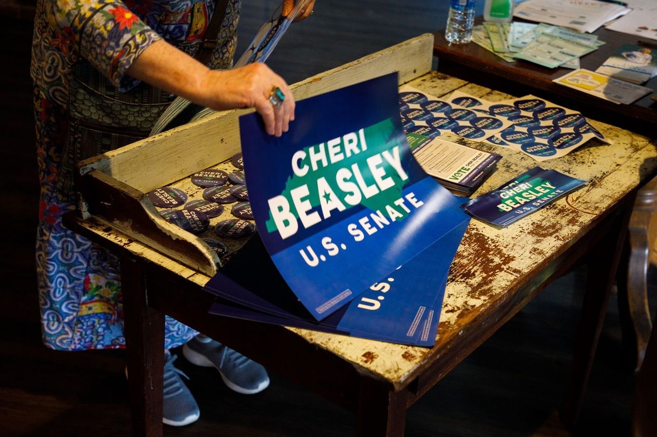 9月8日,北卡羅來納州門羅市,一名參加者在切裏·比斯利的競選活動中拿起一個標語。攝影:Logan Cyrus/Bloomberg News刊登於2022年9月13日印刷版,標題為《2022年投票已經開始》。